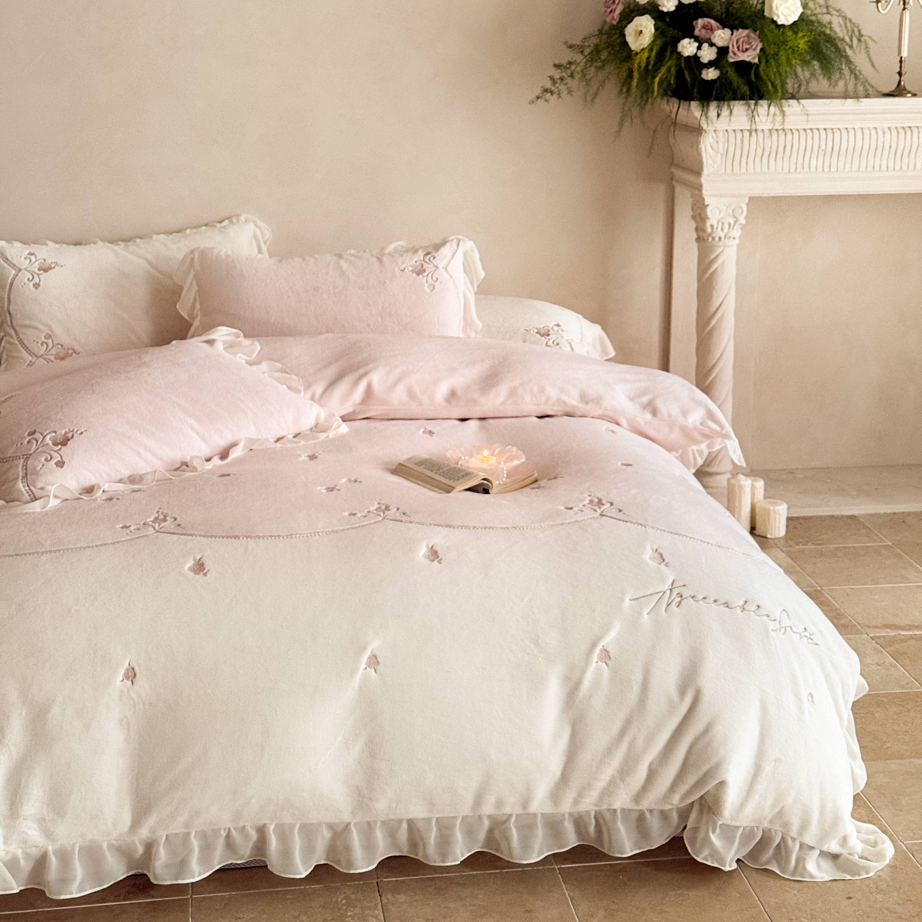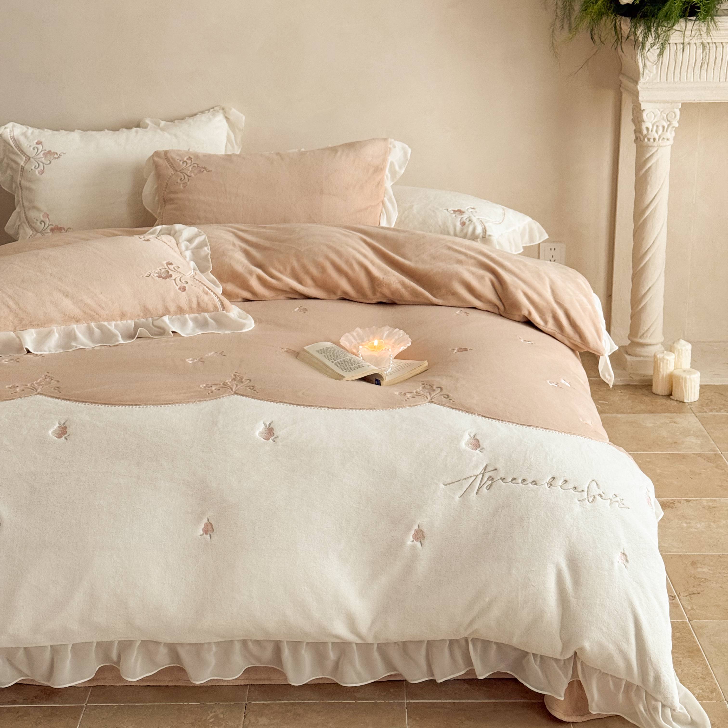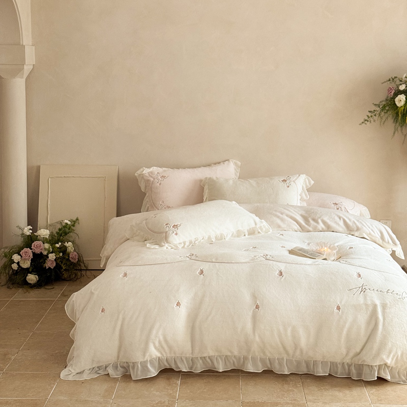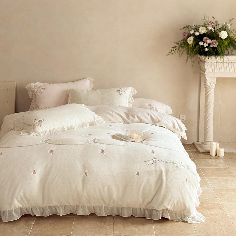 (总)黛舒家居 2025新款牛奶绒绣花纯色拼接刺绣款花边四件套,瑰月汐-白,瑰月汐-粉,瑰月汐-卡其