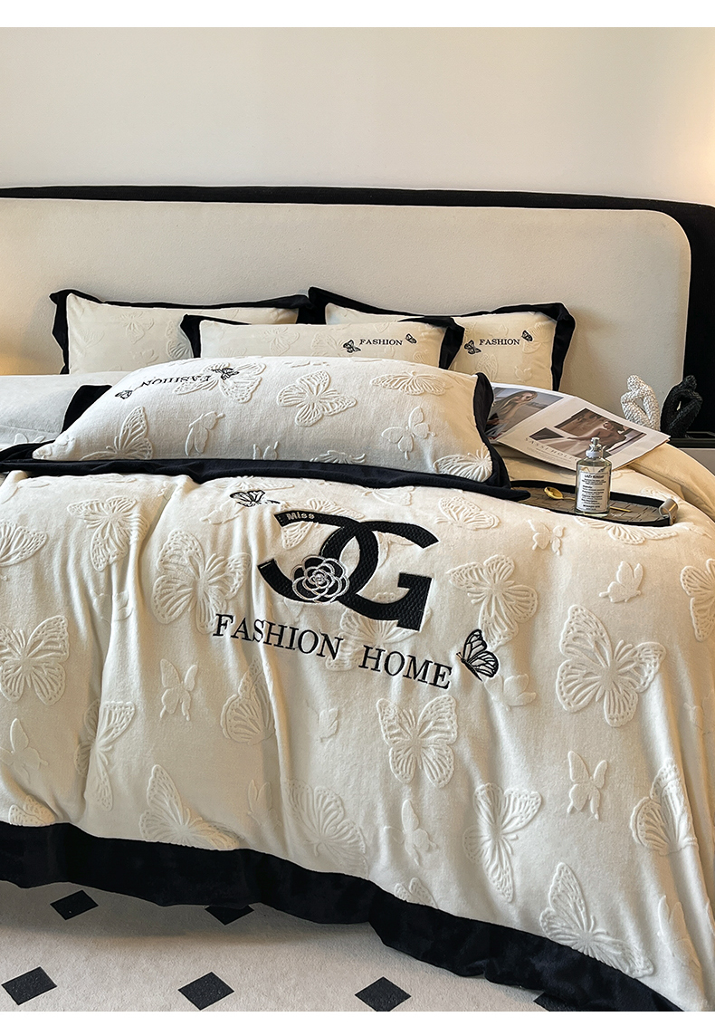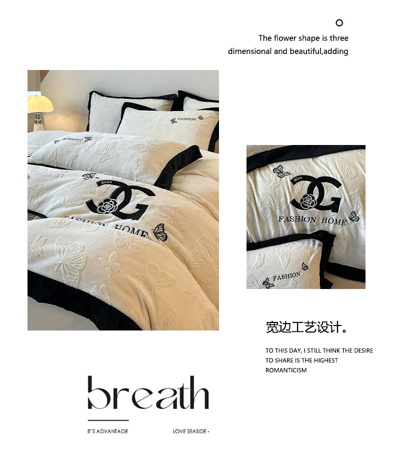 (总)子曰 2025新款雕花加厚牛奶绒宽边工艺款四件套-小香风,小香风-咖,小香风-粉,小香风-绿,小香风-米白,小香风-紫