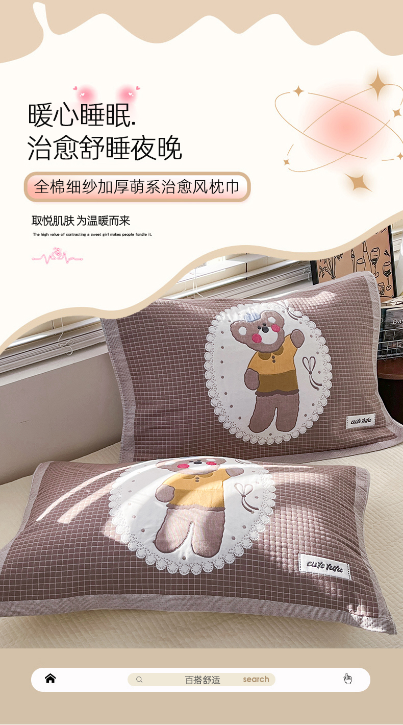 (总)美宜家 2026新款全棉细纱加厚萌系治愈风枕巾,条纹蘑菇一只,伙伴一只,萌萌兔一只,绅士熊一只,童趣一只,小暖狗一只,条纹蘑菇一对,伙伴一对,萌萌兔一对,绅士熊一对,童趣一对,小暖狗一对
