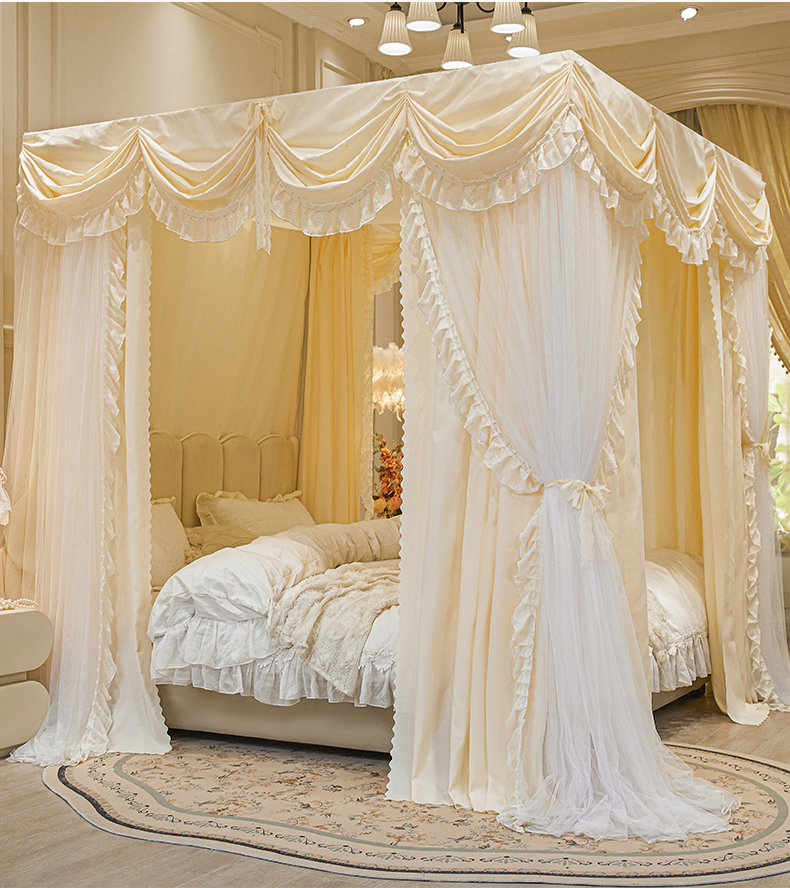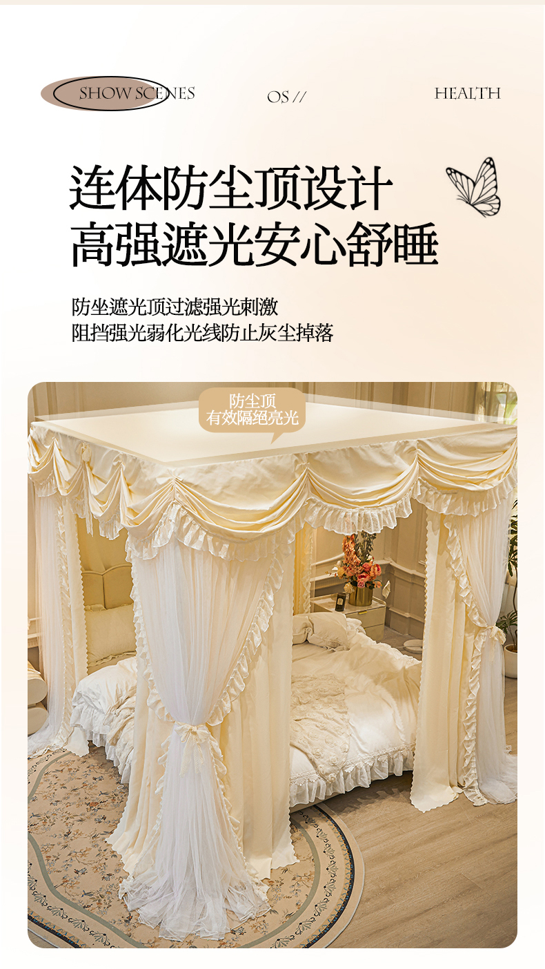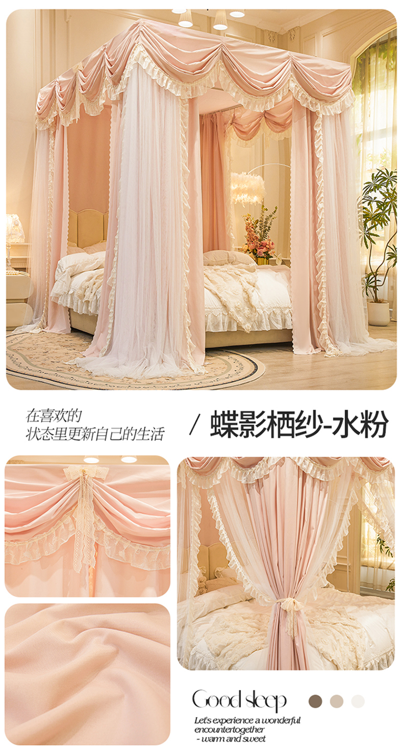 艾晶美家纺有限公司 2026新款法式公主风 双杆双层落地床幔遮光蚊帐 蝶影栖纱-暖玉