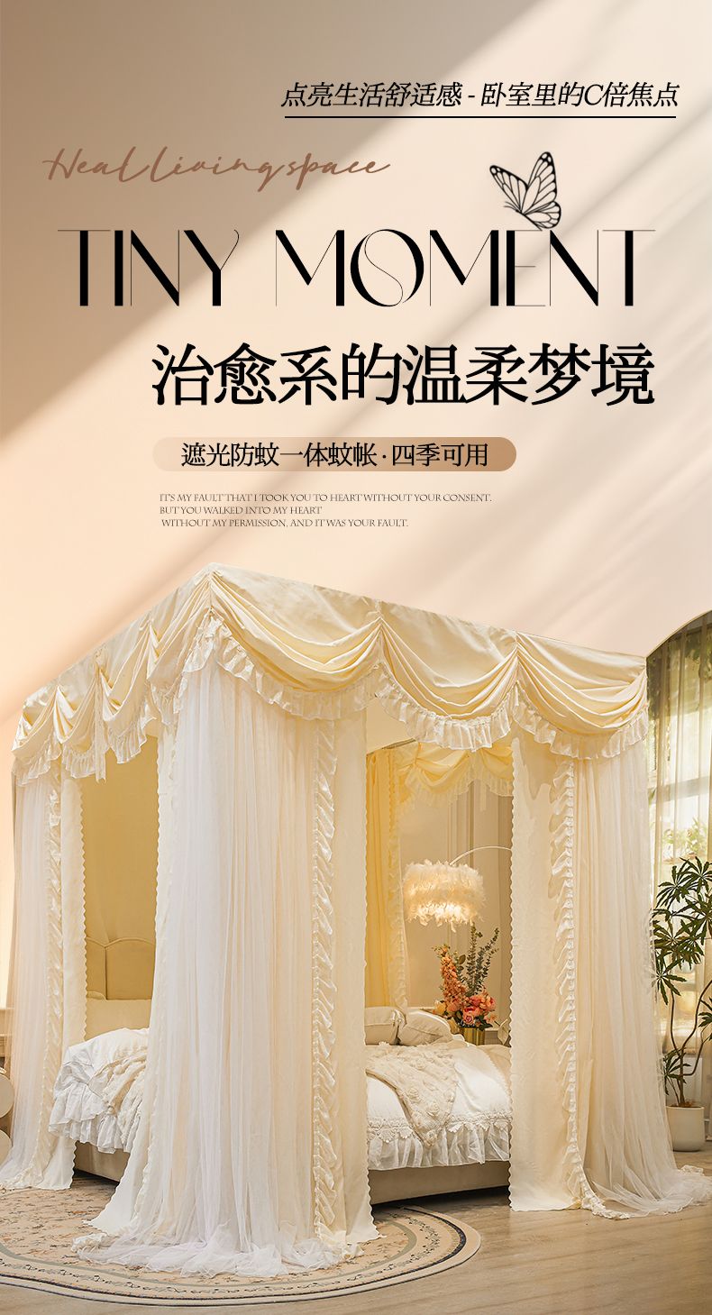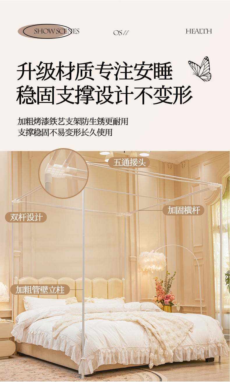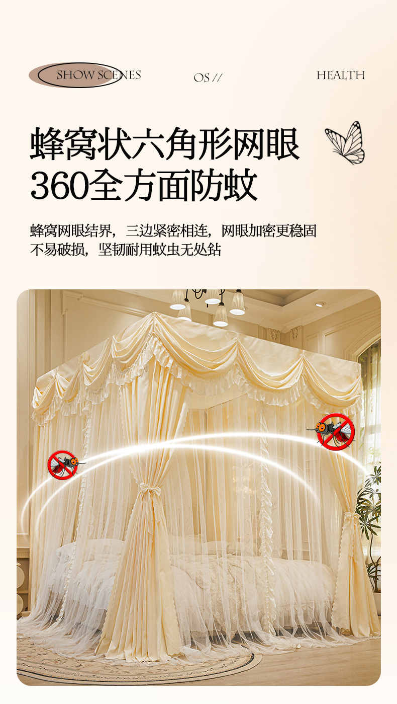 艾晶美家纺有限公司 2026新款法式公主风 双杆双层落地床幔遮光蚊帐 蝶影栖纱-暖玉