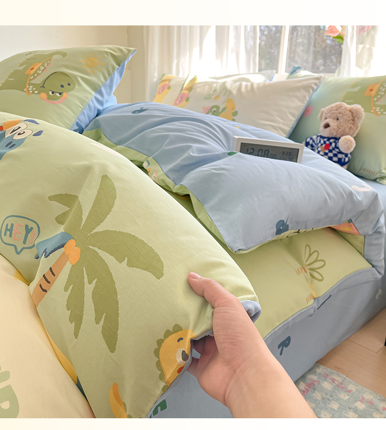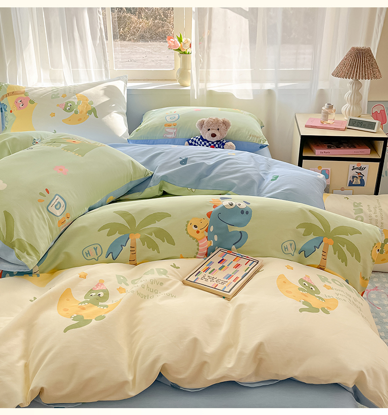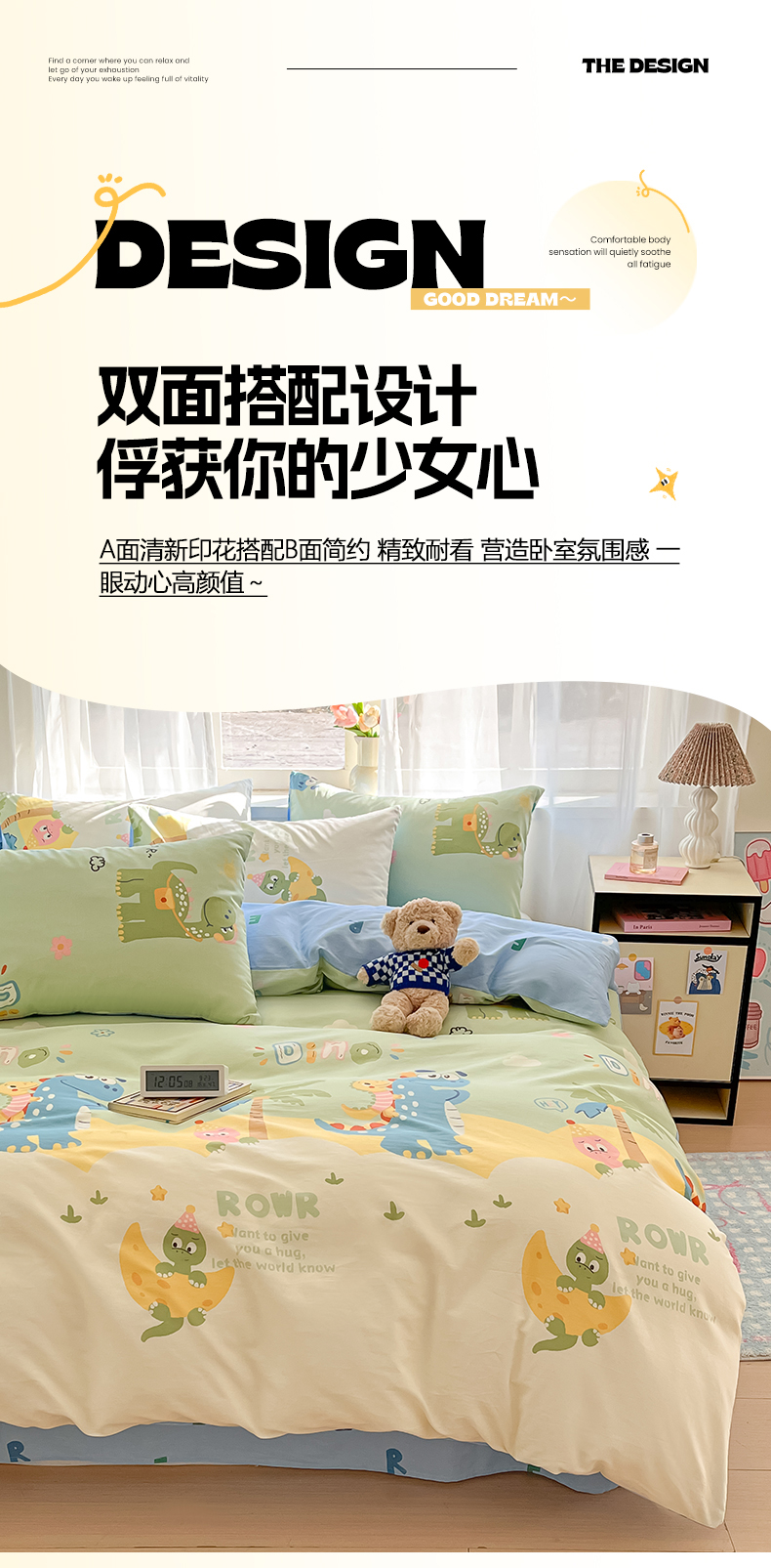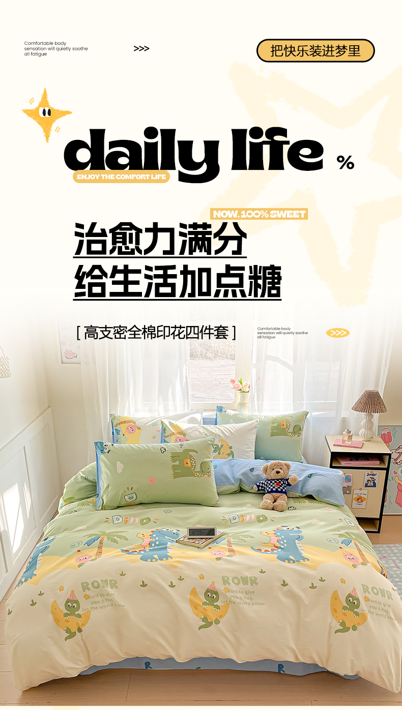 吉象家纺 2026新款高支密全棉印花四件套 度假恐龙