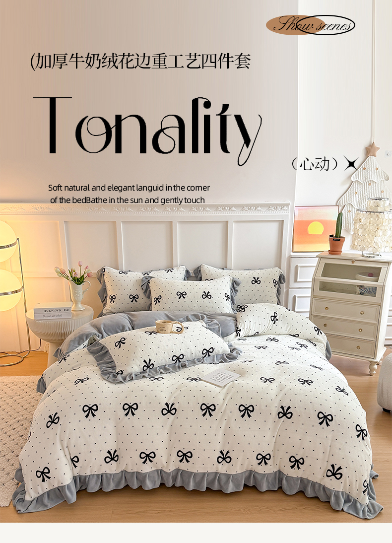 温眠家纺 2025新款200g全工艺牛奶绒花边款四件套吊边床单 简单格调