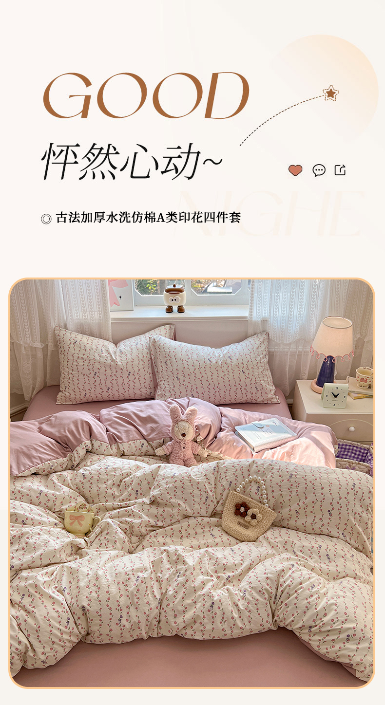 当前位置: 91家纺网 > 商品网购 > 床品套件 > 四件套 > 水洗棉四件套 > 优尚佳生活馆 【提供买家秀】2026新款加厚水洗仿棉A类印花四件套 玫香懒卧