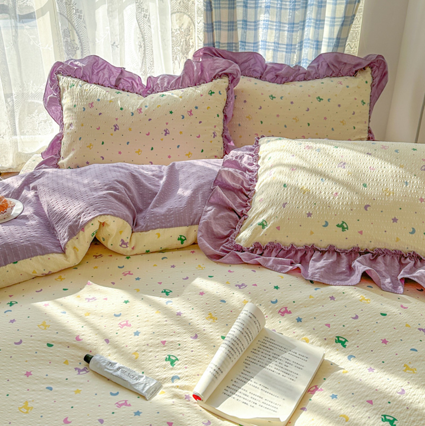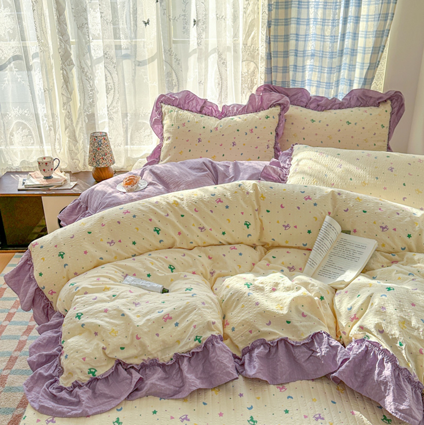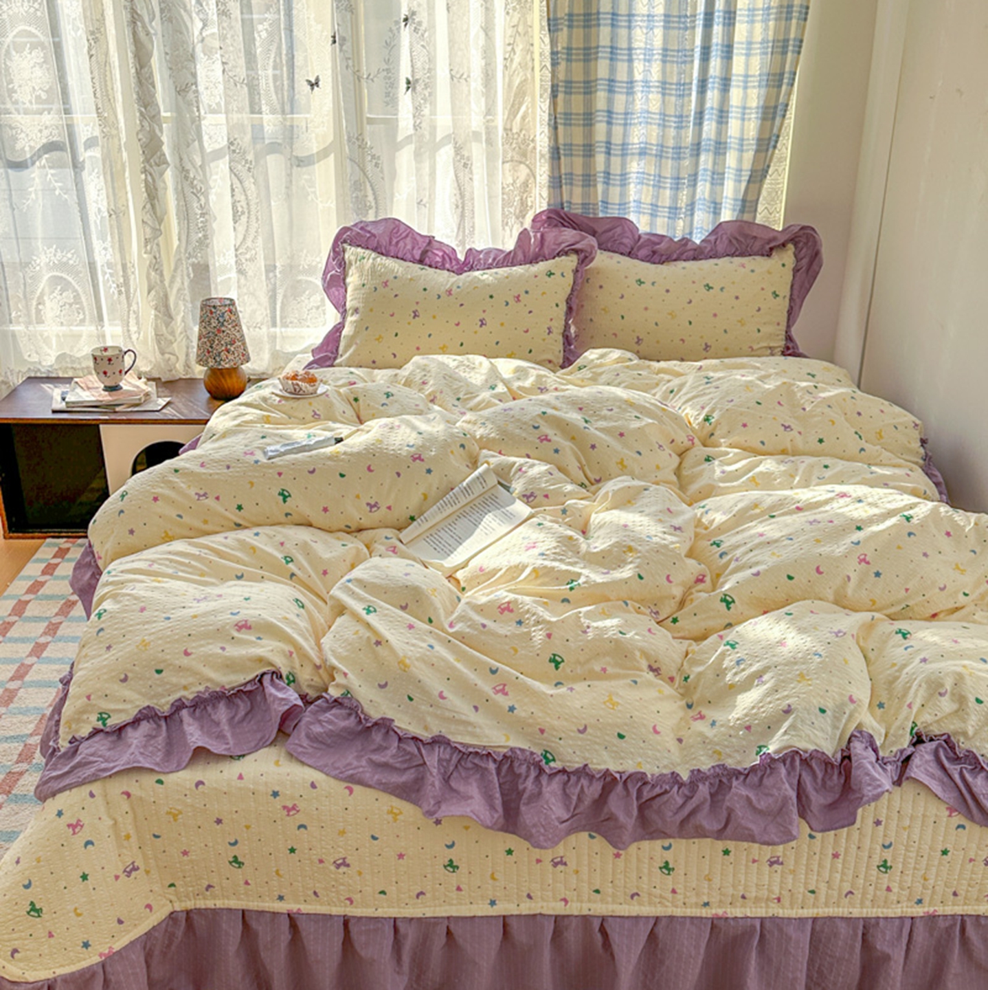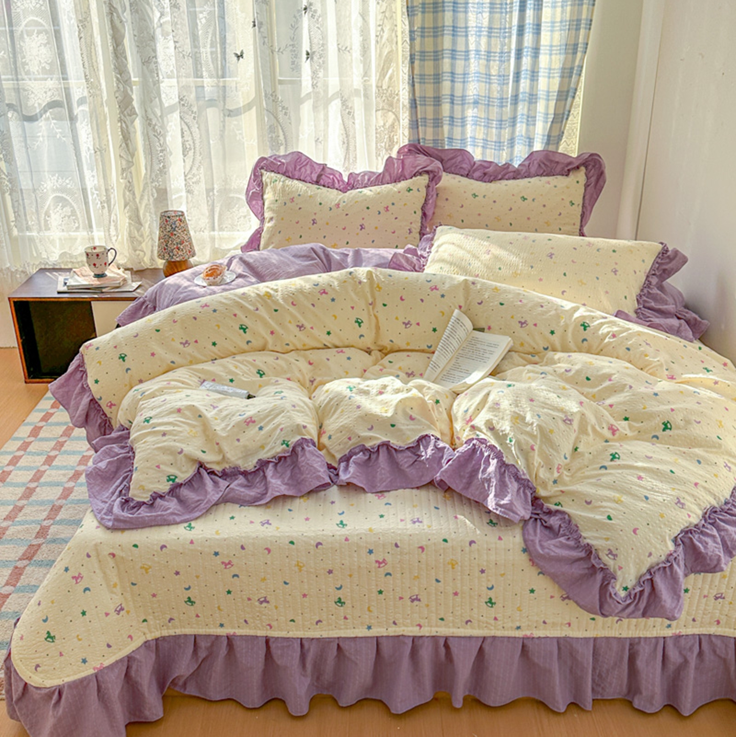 (总)欧尚 2026新款花边床盖四件套,春和,花束,花野,灰樱桃,咖爱心,咖豹纹,咖啡小猫,梨花落,绿爱心,梦境,木马,奶油波点,暖橘枝,暖心,人间草木,田园兔,小女孩,星愿,摇摇马,紫爱心,紫豹纹,紫苏