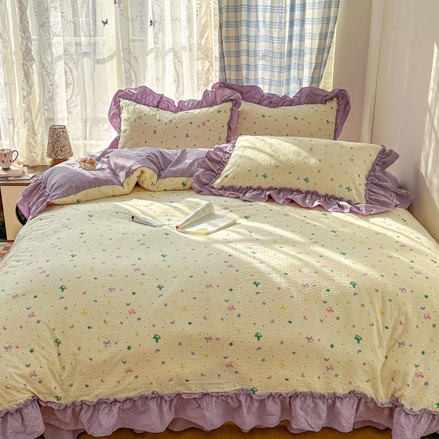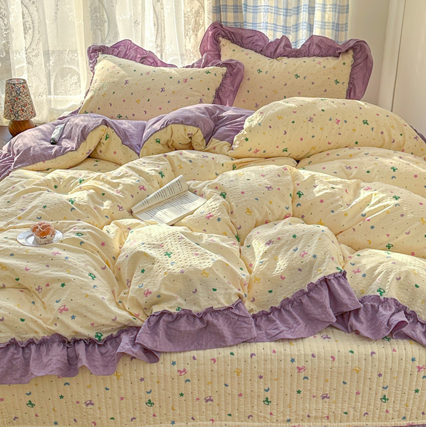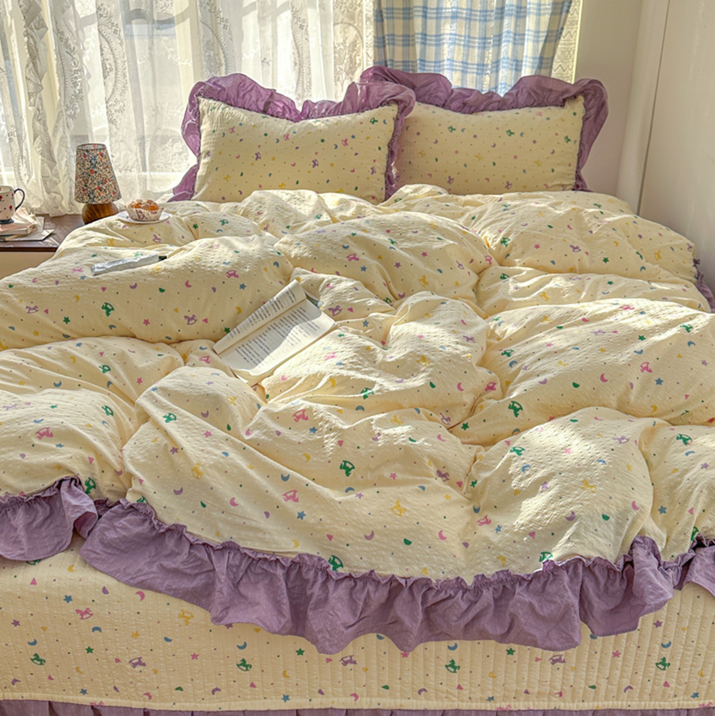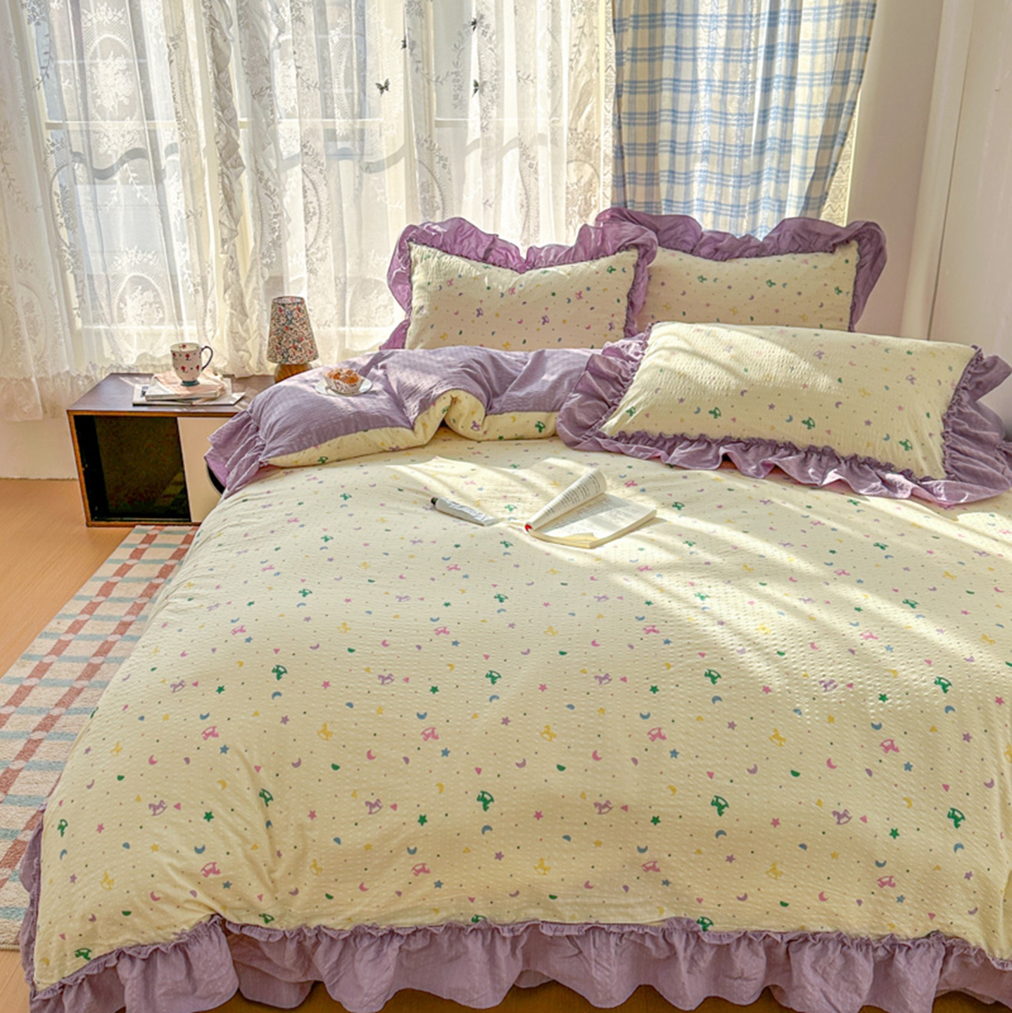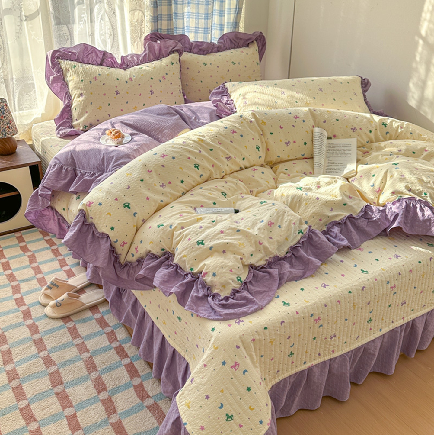 (总)欧尚 2026新款花边床盖四件套,春和,花束,花野,灰樱桃,咖爱心,咖豹纹,咖啡小猫,梨花落,绿爱心,梦境,木马,奶油波点,暖橘枝,暖心,人间草木,田园兔,小女孩,星愿,摇摇马,紫爱心,紫豹纹,紫苏