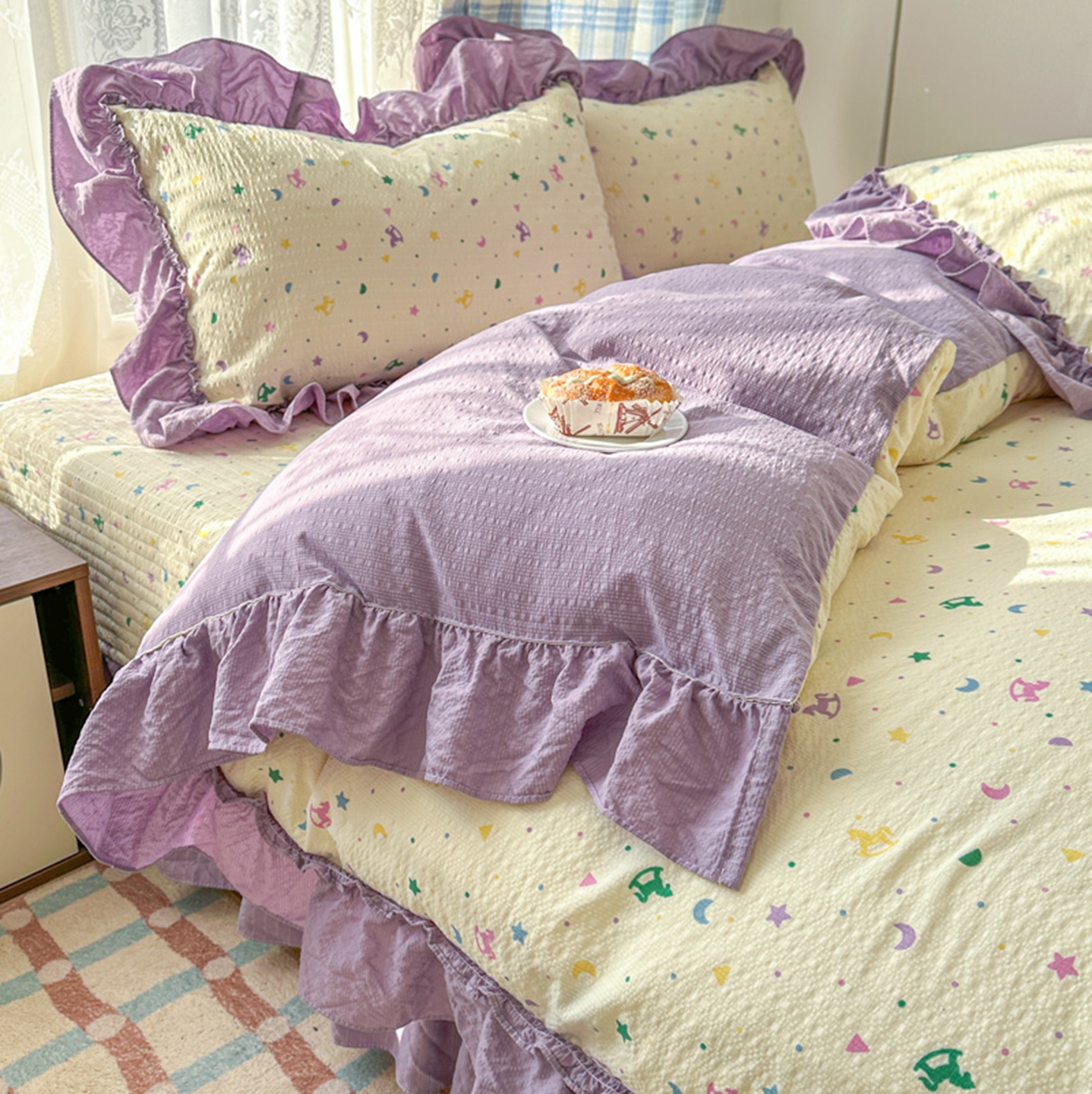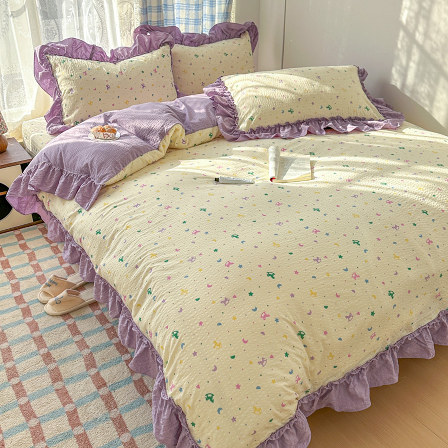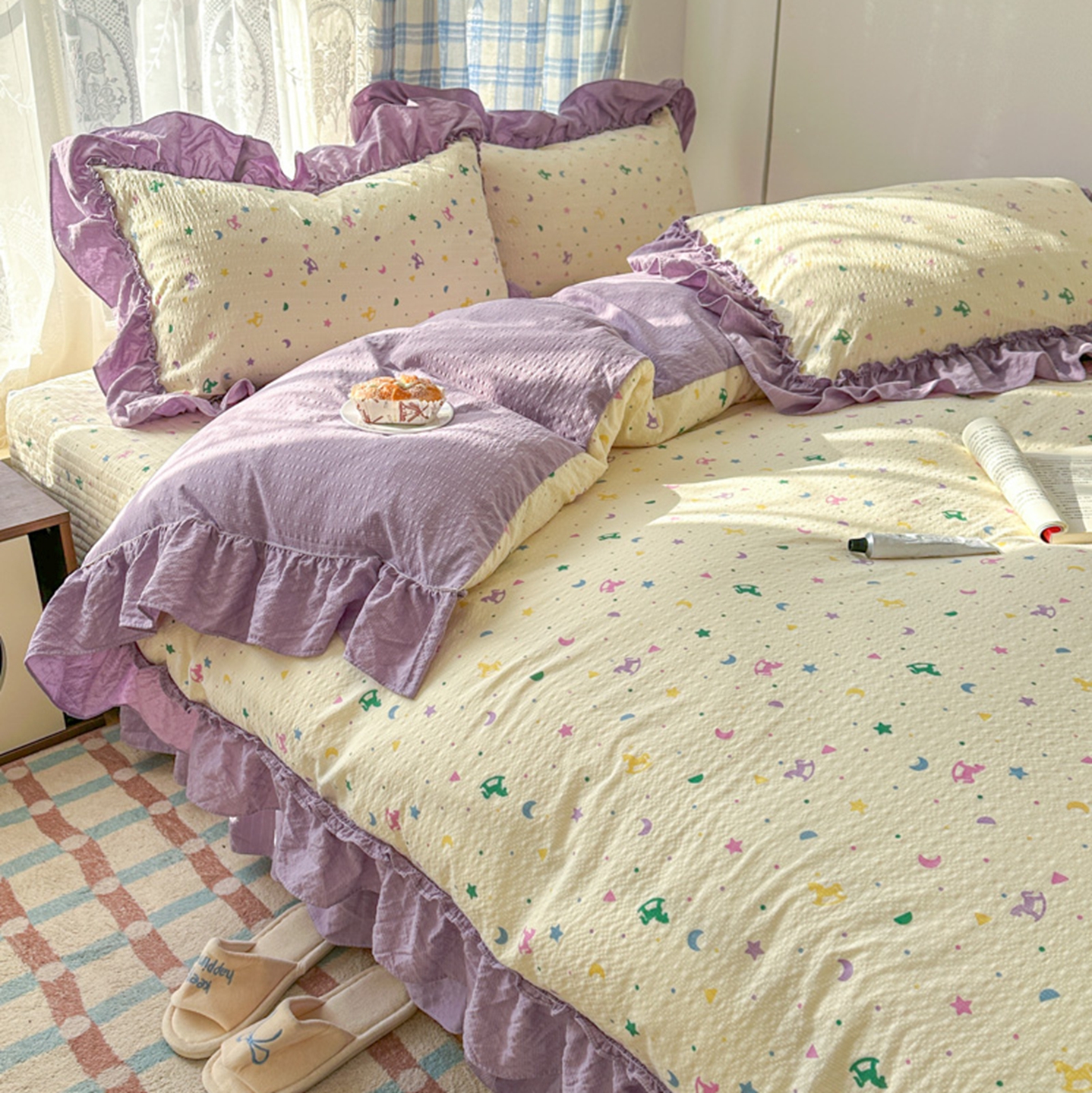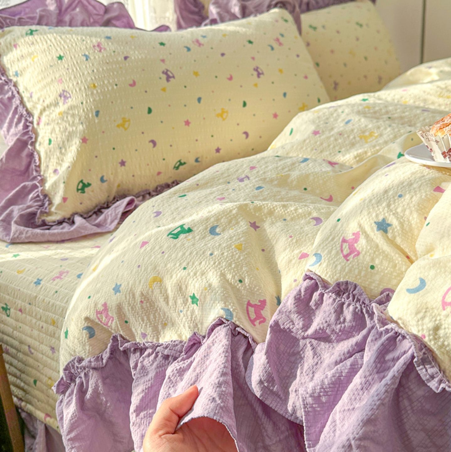 (总)欧尚 2026新款花边床盖四件套,春和,花束,花野,灰樱桃,咖爱心,咖豹纹,咖啡小猫,梨花落,绿爱心,梦境,木马,奶油波点,暖橘枝,暖心,人间草木,田园兔,小女孩,星愿,摇摇马,紫爱心,紫豹纹,紫苏