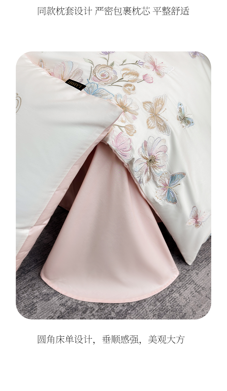 商品名称:莱势 2026新品100支纯棉全棉50x50s贡缎长绒棉刺绣绣花四件套高端礼盒-蝴蝶泉边 蝴蝶泉边-白拼粉