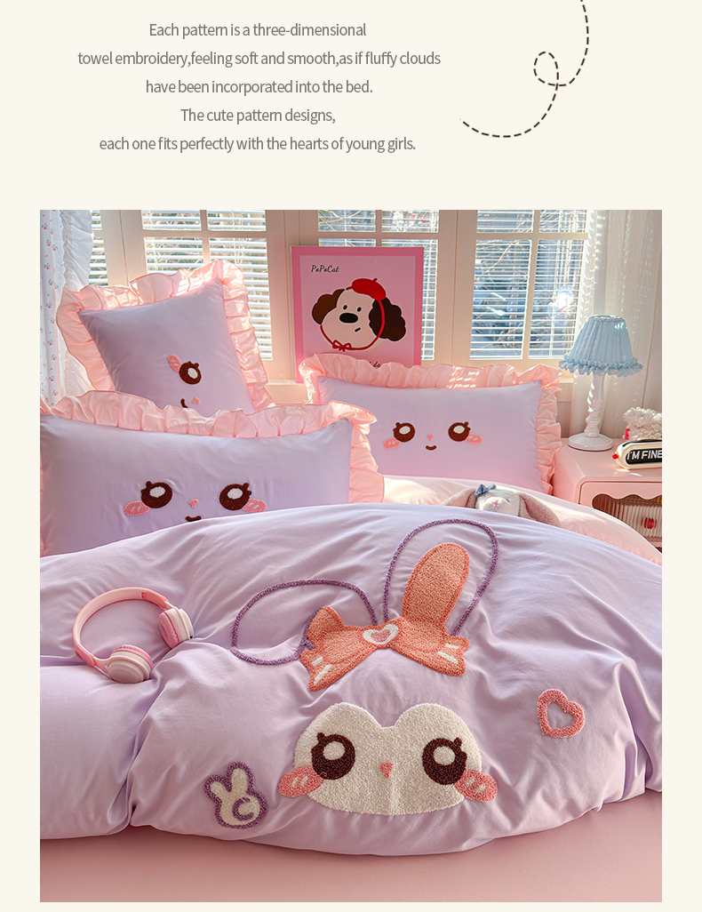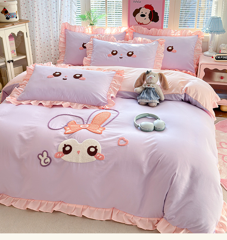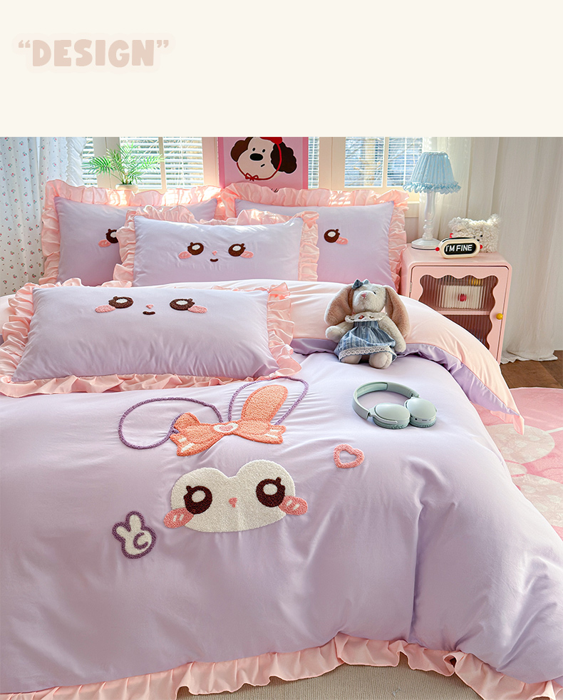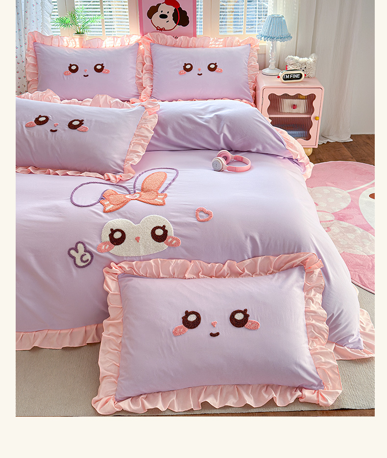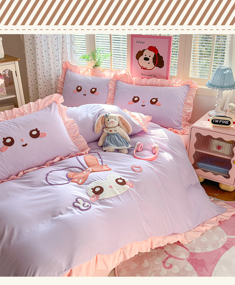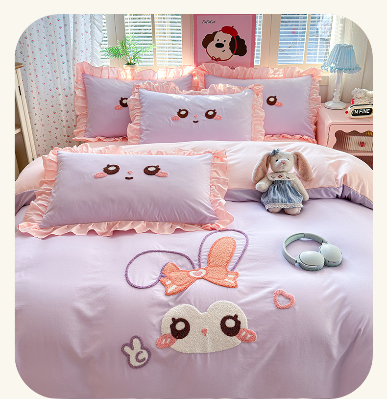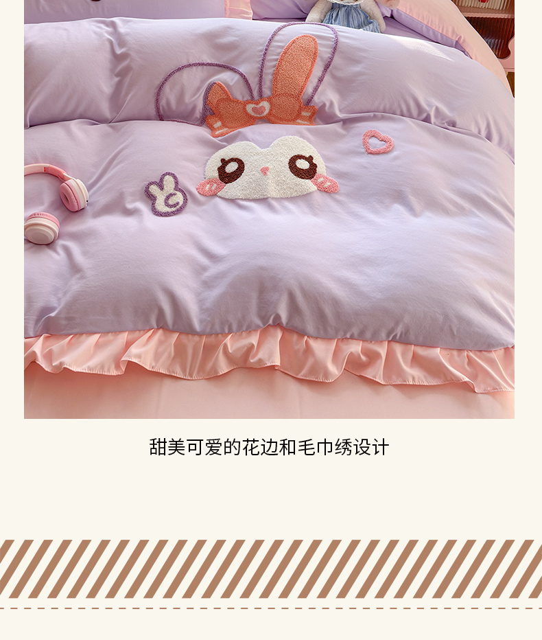 当前位置: 91家纺网 > 商品网购 > 床品套件 > 四件套 > 水洗棉四件套 > 易禾家纺 2026新款韩版卡通可爱风水洗棉毛巾绣四件套系列(专版花型) 大耳兔-紫粉