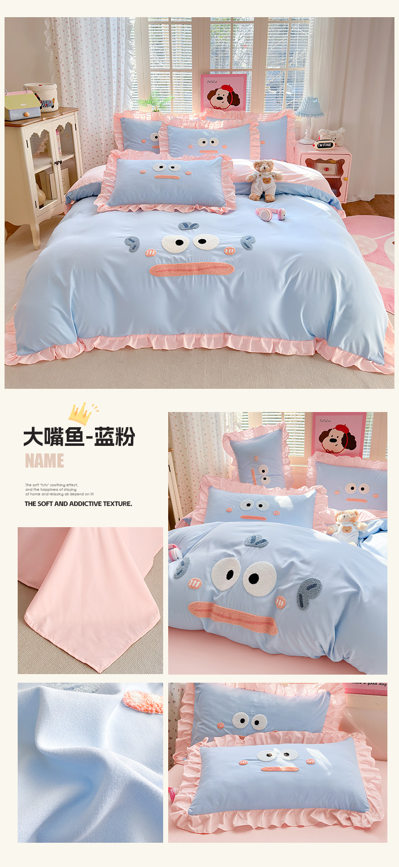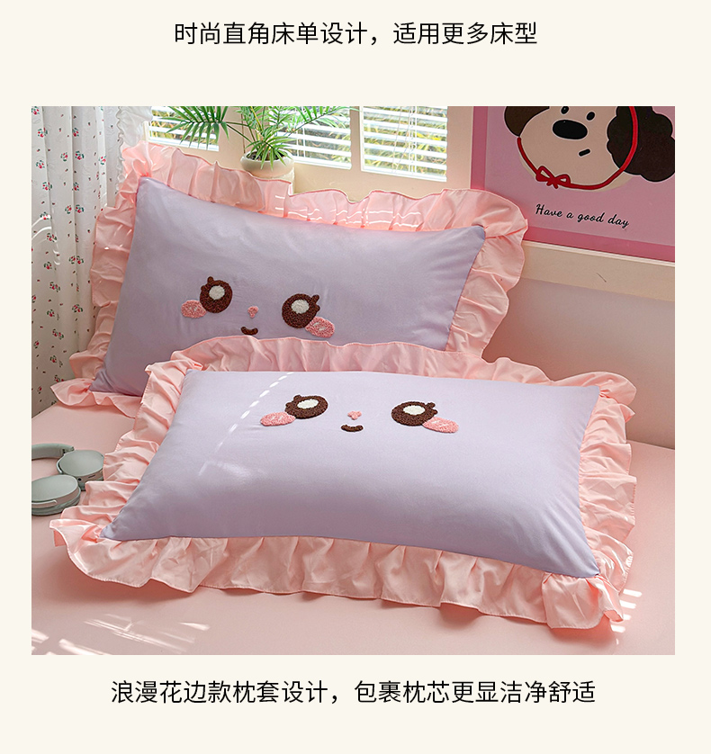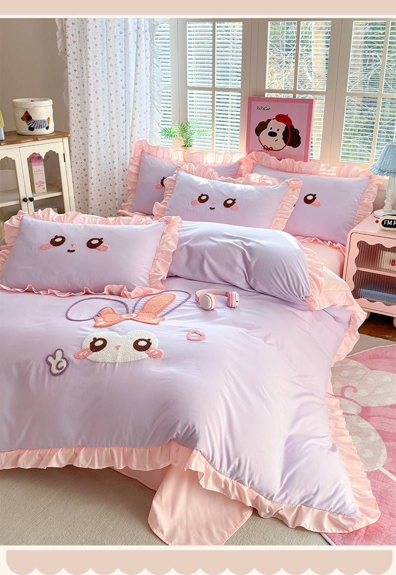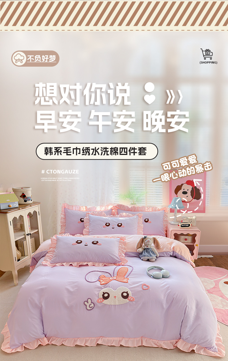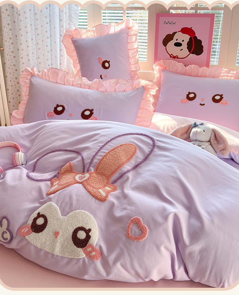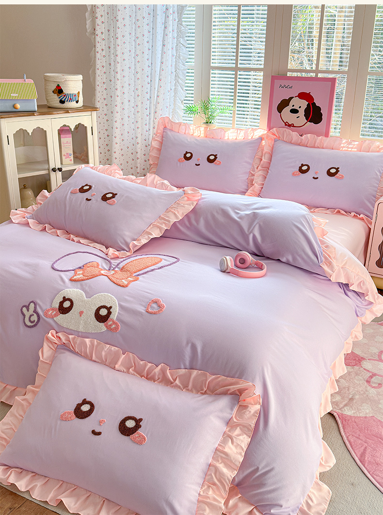 当前位置: 91家纺网 > 商品网购 > 床品套件 > 四件套 > 水洗棉四件套 > 易禾家纺 2026新款韩版卡通可爱风水洗棉毛巾绣四件套系列(专版花型) 大耳兔-紫粉