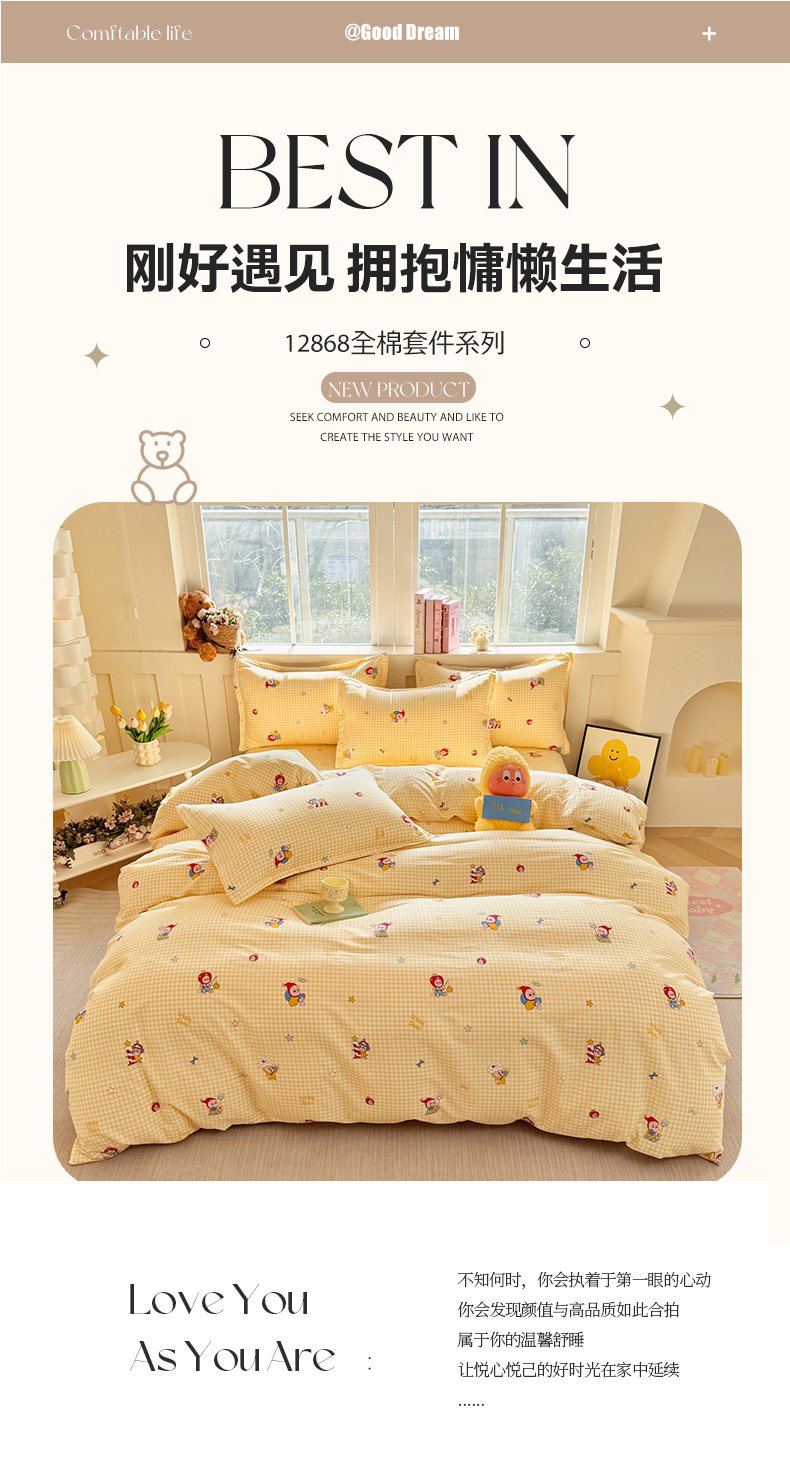 • 91家纺网 家纺一手货源 找家纺 (总)简冠家纺 2026新款12868印花全棉四件套纯棉四件套,贝贝莉亚-黄,布朗熊,城南花开,初享时光-咖,初心-粉,初心-绿,精灵王国-黄,快乐动物城,生活日记-蓝,碎花拾影,田园诗篇-米,小飞象,星空印记
