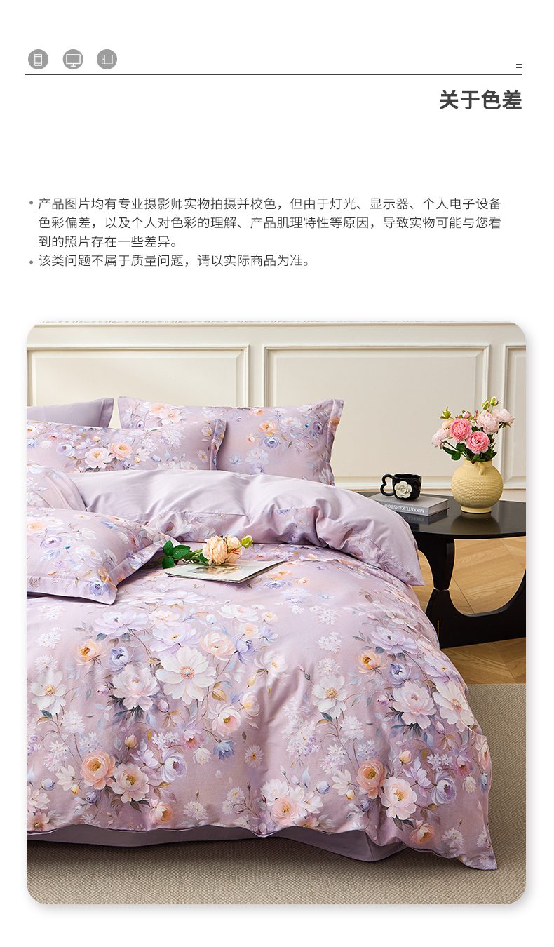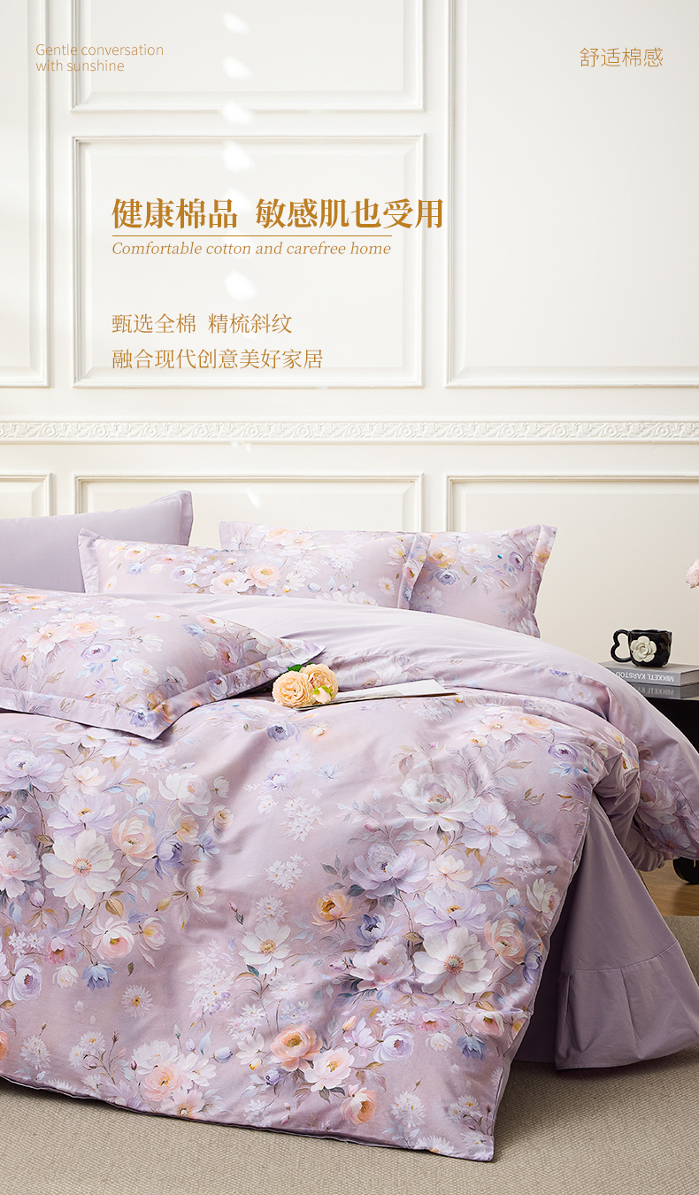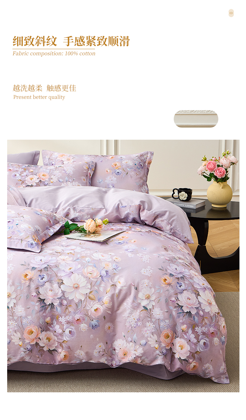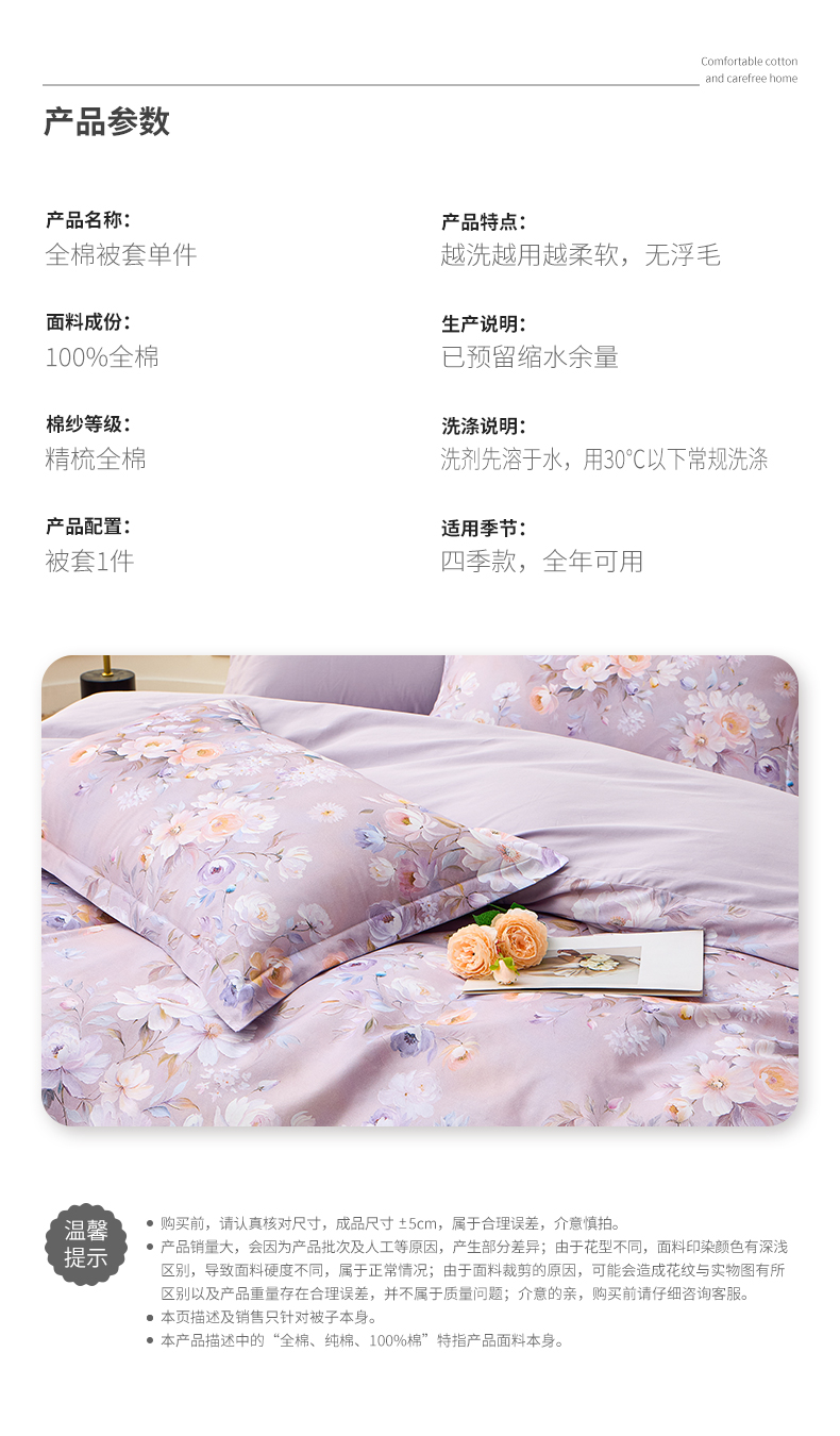 商品名称:元元家居(元元被业) 2026新款全棉13372套件及单品【印花款】-单被套 花漾紫