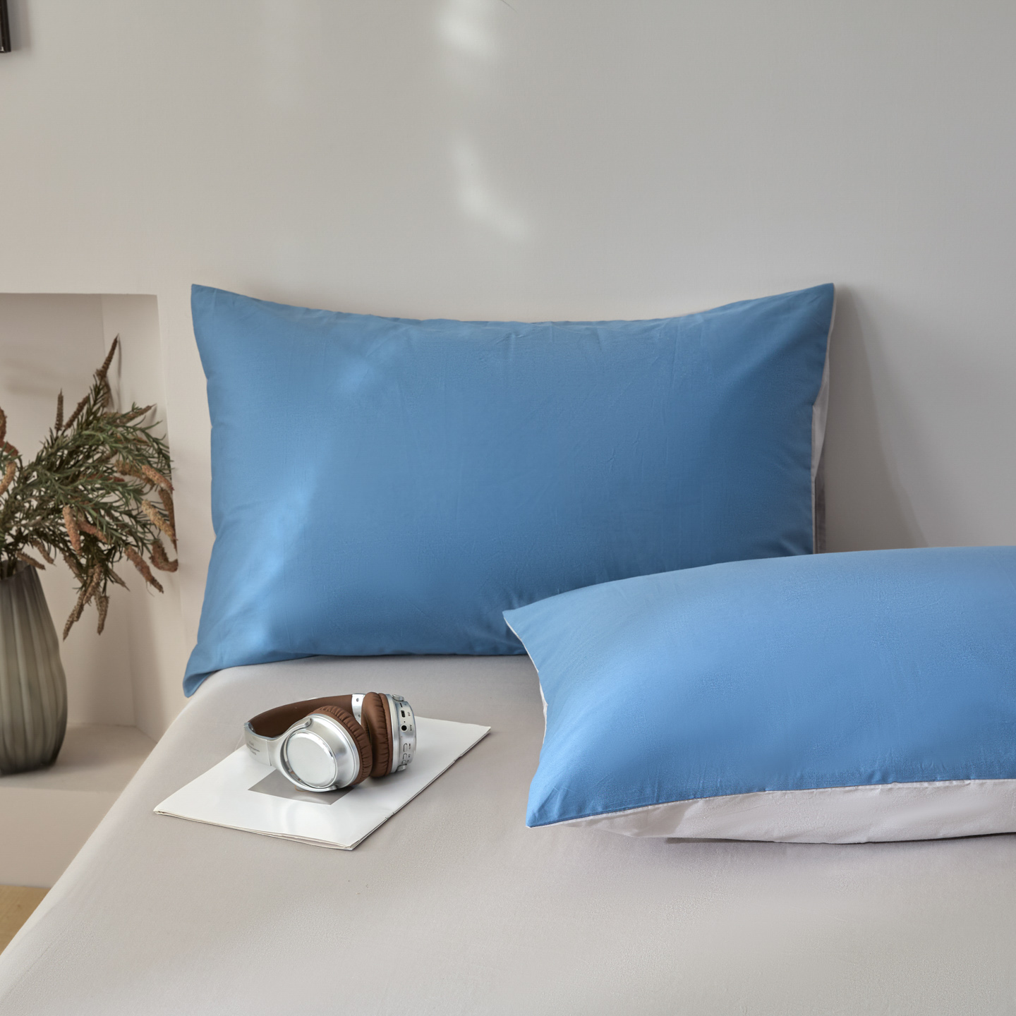 床上用品 > 枕套 > 泽西家纺+V17798841158发大图 2026新款全棉13376双拼纯色简约纯棉枕套枕套单件单枕套 淡蓝+深灰