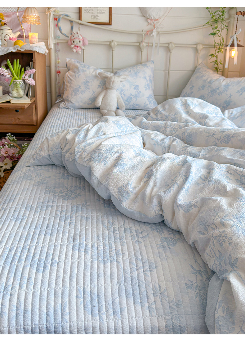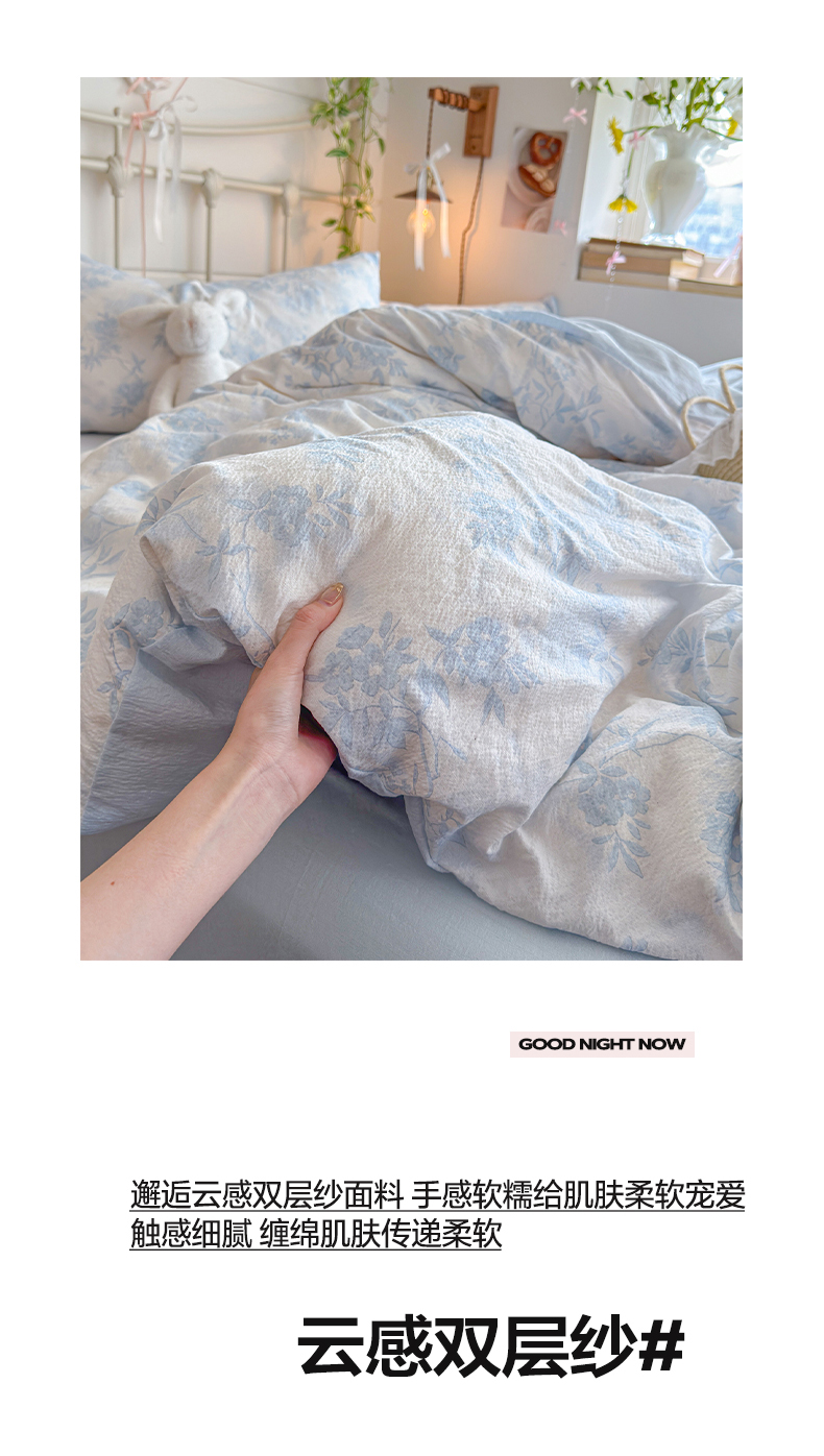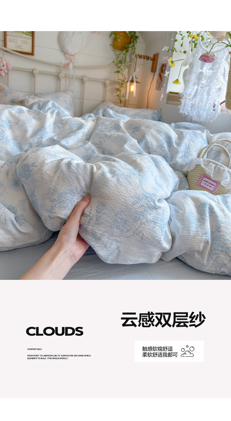当前位置: 91家纺网 > 商品网购 > 床品套件 > 四件套 > 双层纱四件套 > 优选 2026新款小清新直播热卖款云感双层纱木棉床盖四件套系列 冰菱花