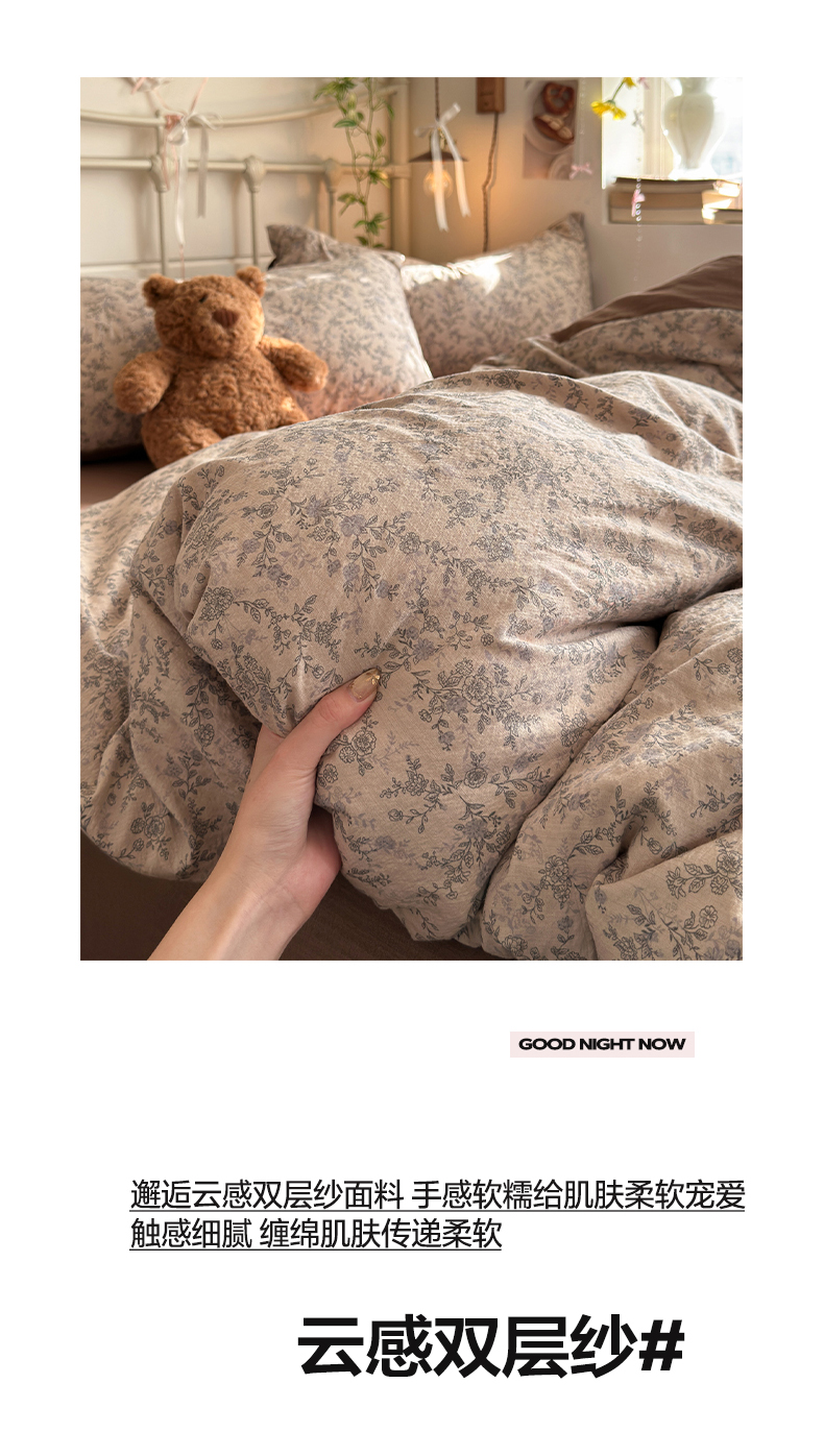 当前位置: 91家纺网 > 商品网购 > 床品套件 > 四件套 > 双层纱四件套 > 优选 2026新款小清新直播热卖款云感双层纱木棉床盖四件套系列 清墨