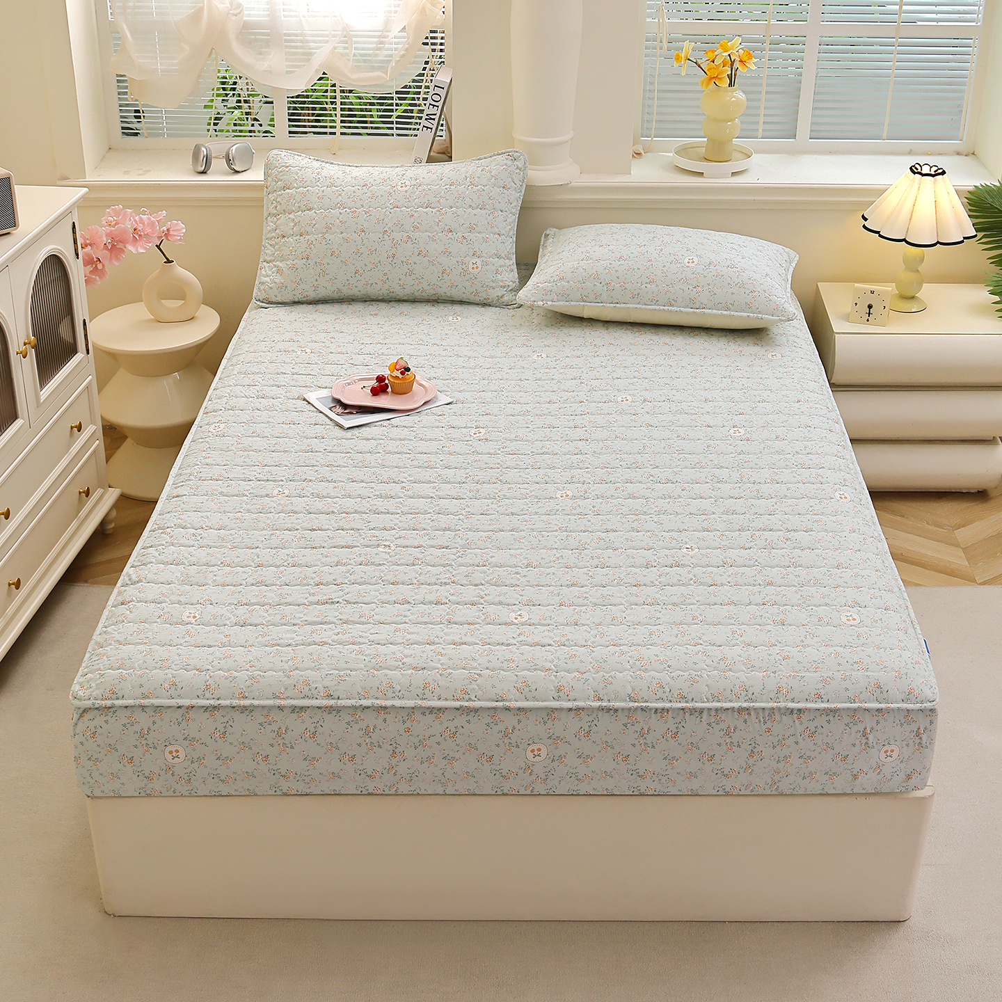 • 91家纺网 家纺一手货源 找家纺 (总)彩亿家纺 2026春夏新品四季床盖泡芙棉双层纱蕾丝床裙加厚床单,甜心绿,甜心粉,甜心灰,夏花,小桃兔