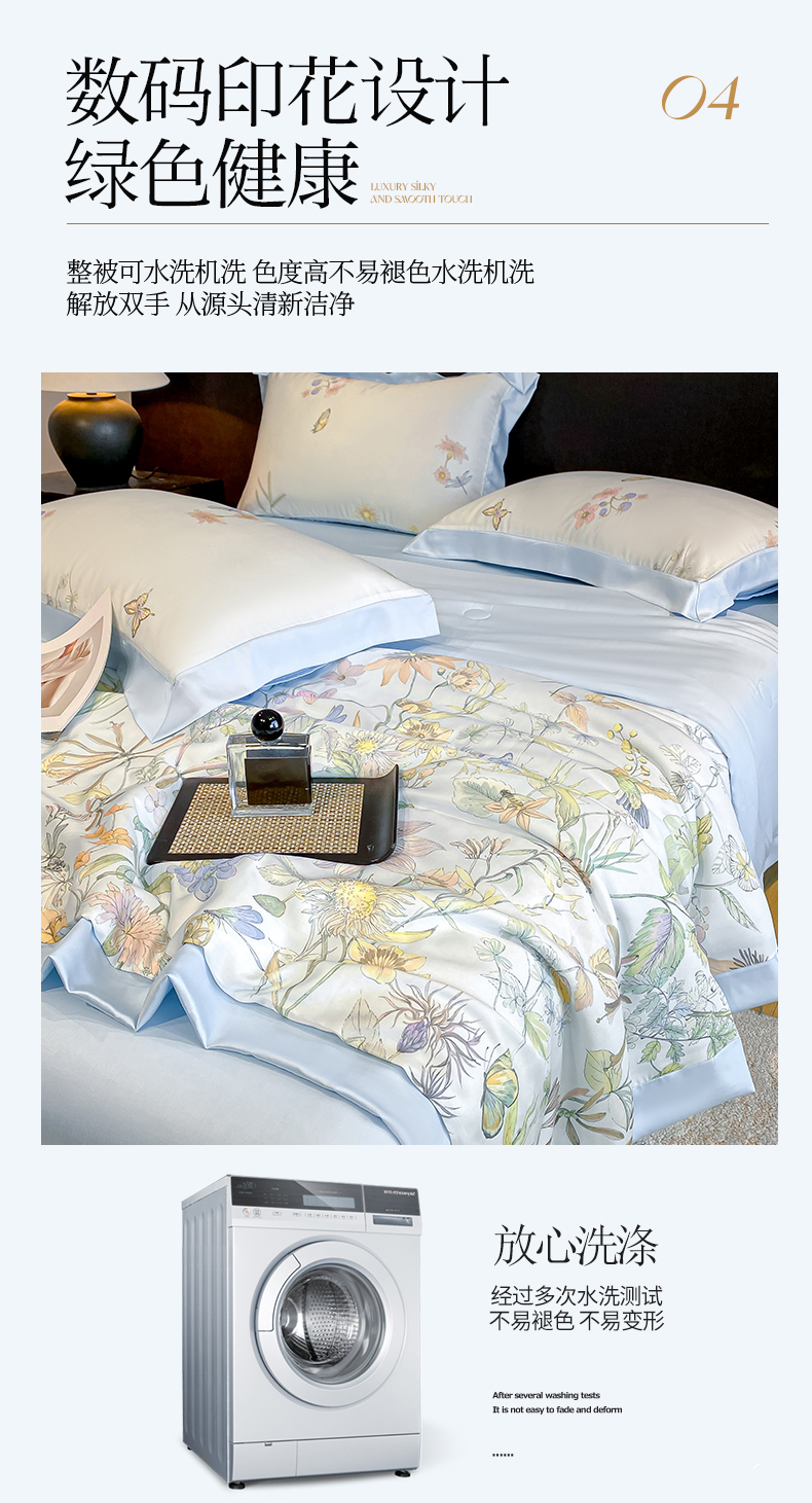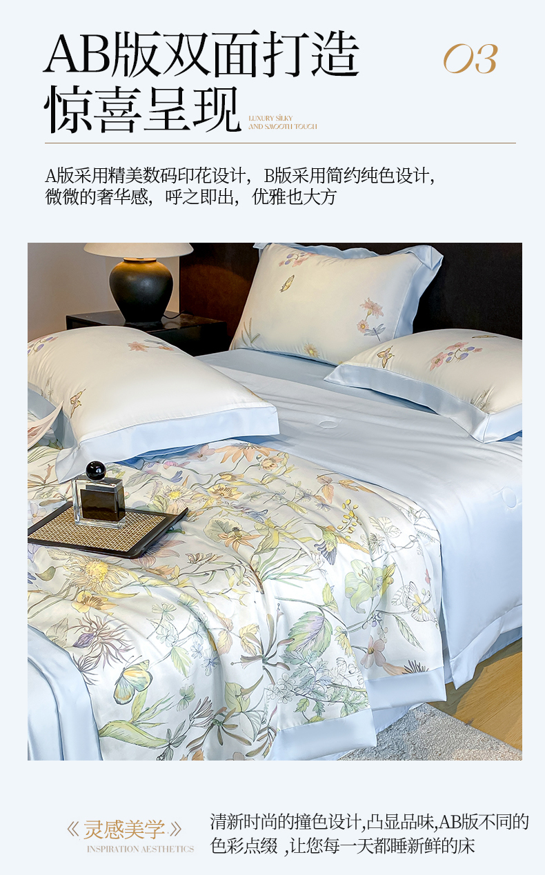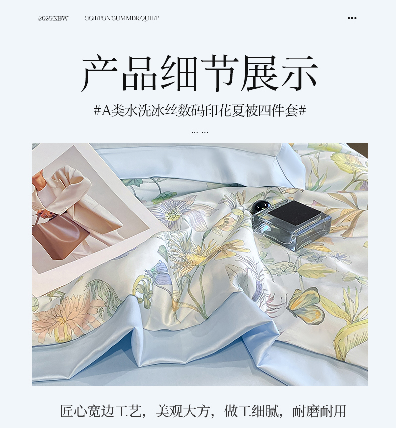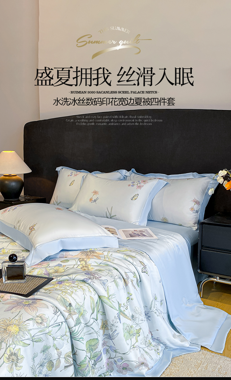 • 91家纺网 家纺一手货源 找家纺 笙意家纺 2026A类水洗冰丝数码印花宽边夏被四件套忆梦
