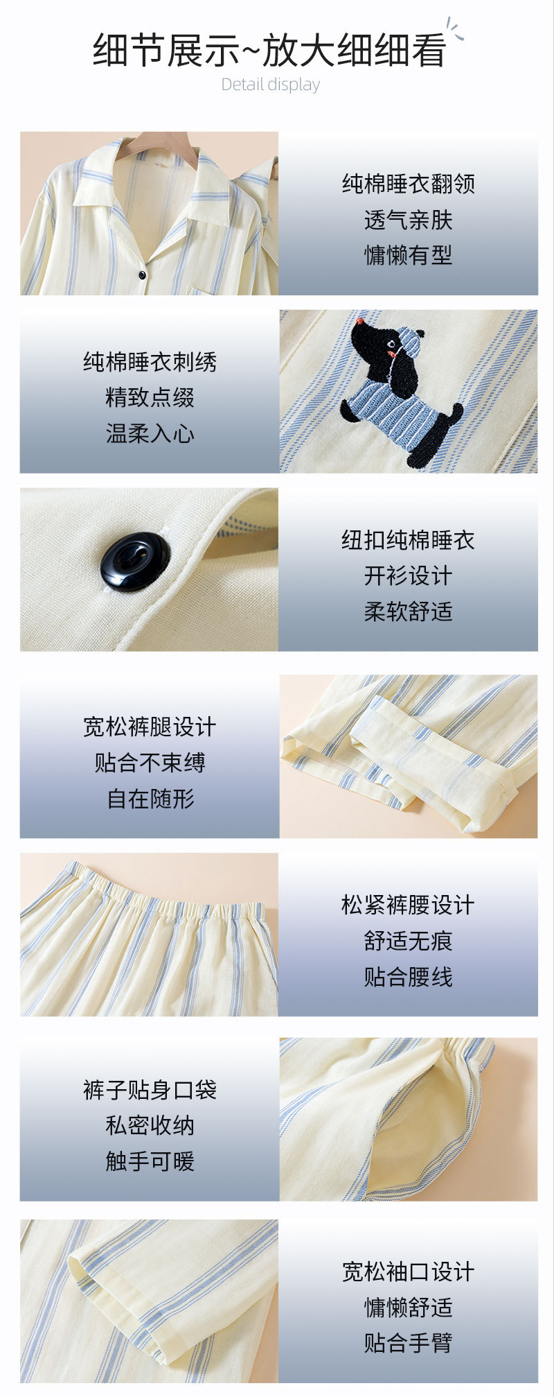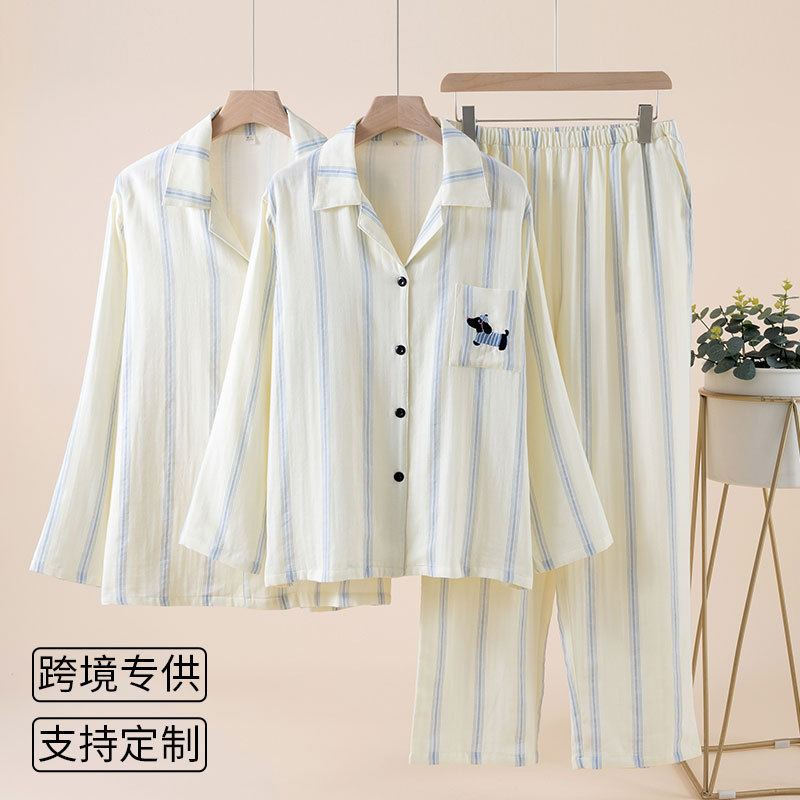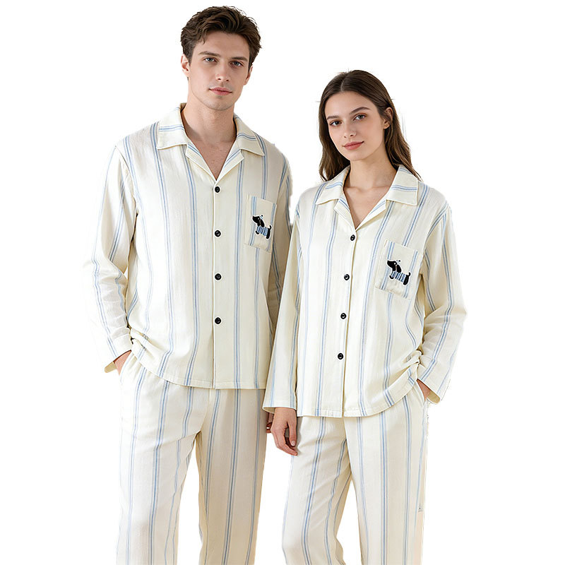 (总)洛兰沙家居馆 情侣睡衣女春秋季长袖棉质可外穿男生翻领开衫春秋家居服条纹套装