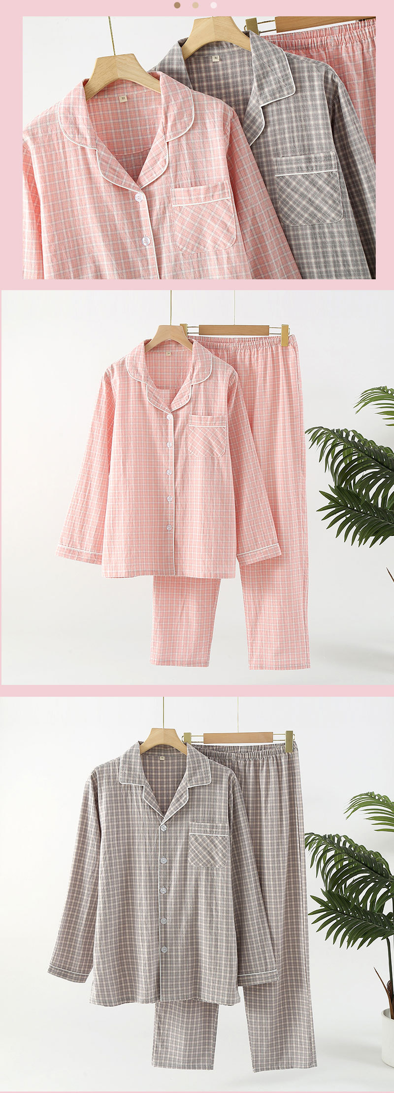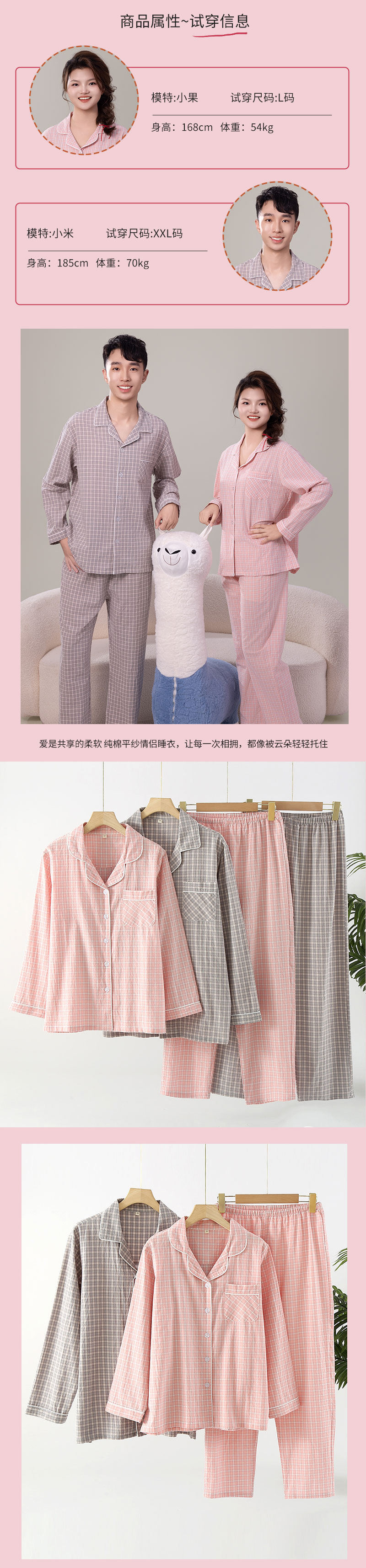 (总)洛兰沙家居馆 日式纯棉情侣睡衣春秋夏季无印风男女纱布长袖长裤家居服套装,女款粉格,女款绿格,男款咖格