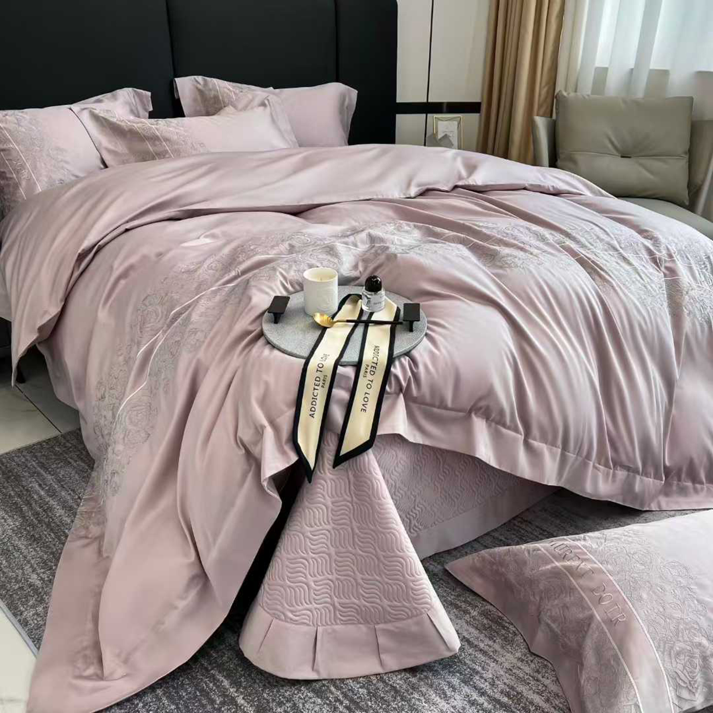 (总)edra 2026新款真丝天丝轻奢提花床盖款四件套-繁花,繁花-深灰,繁花-银灰