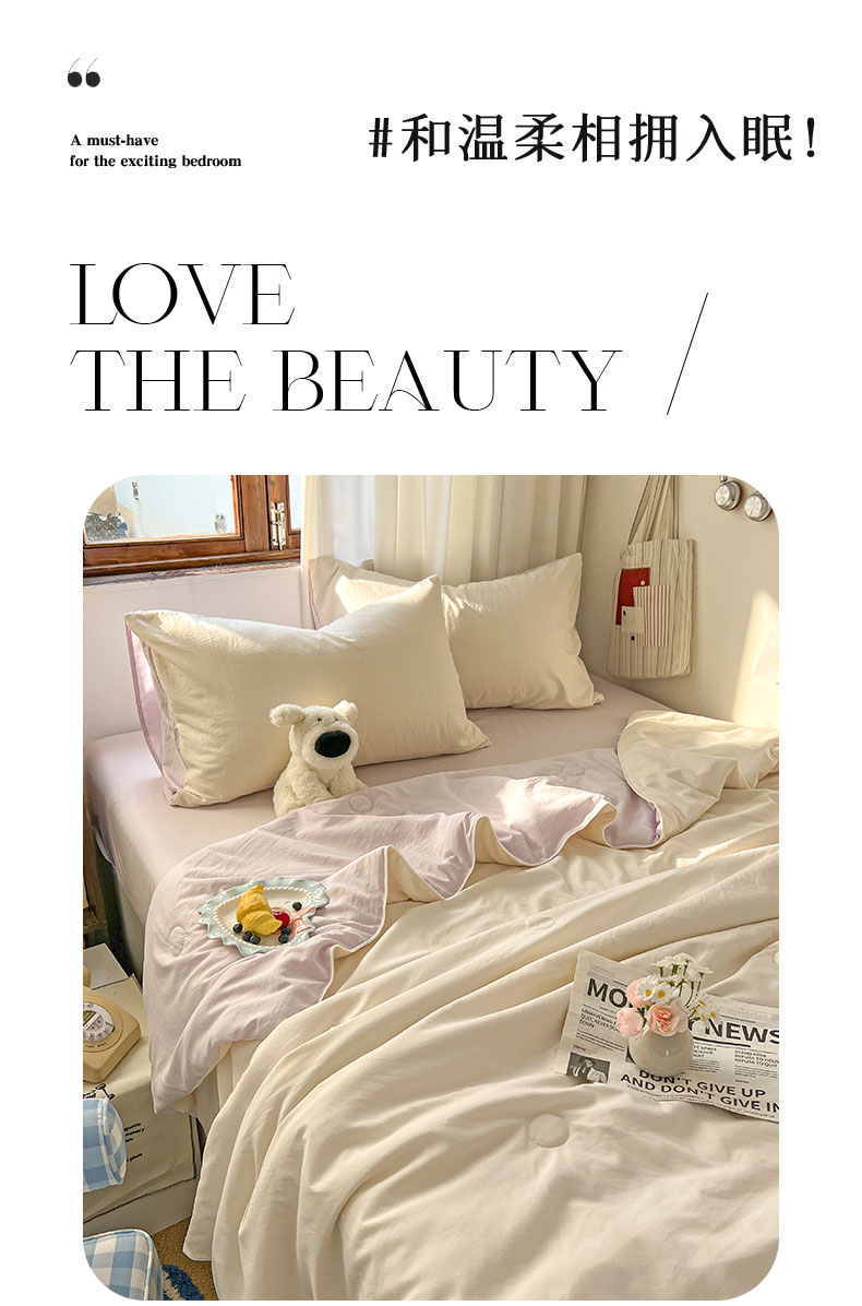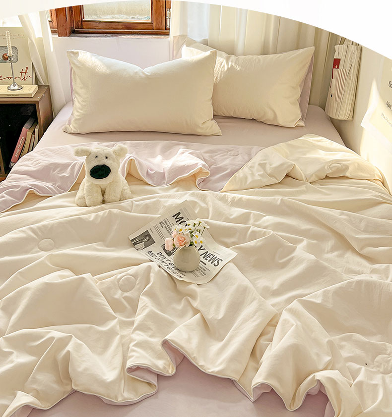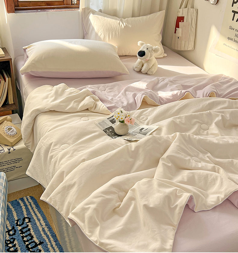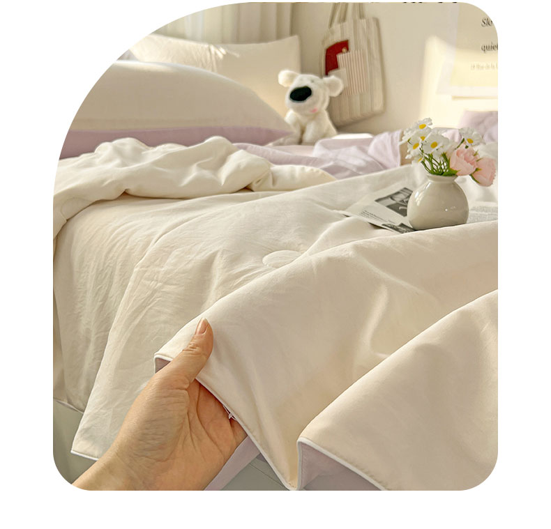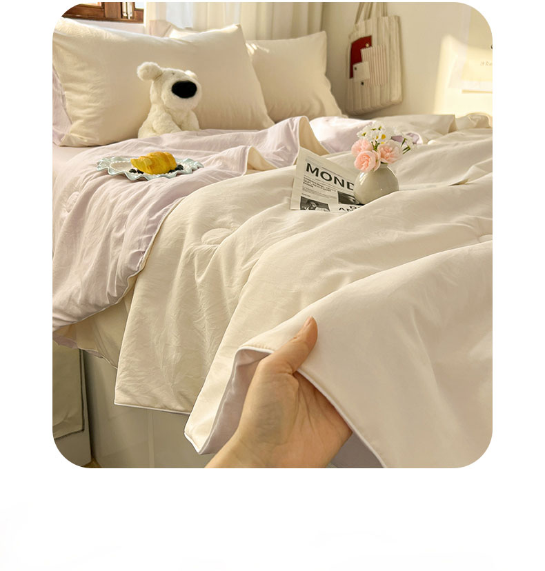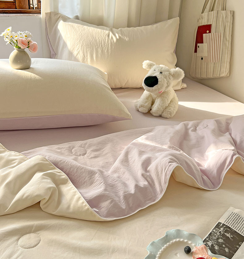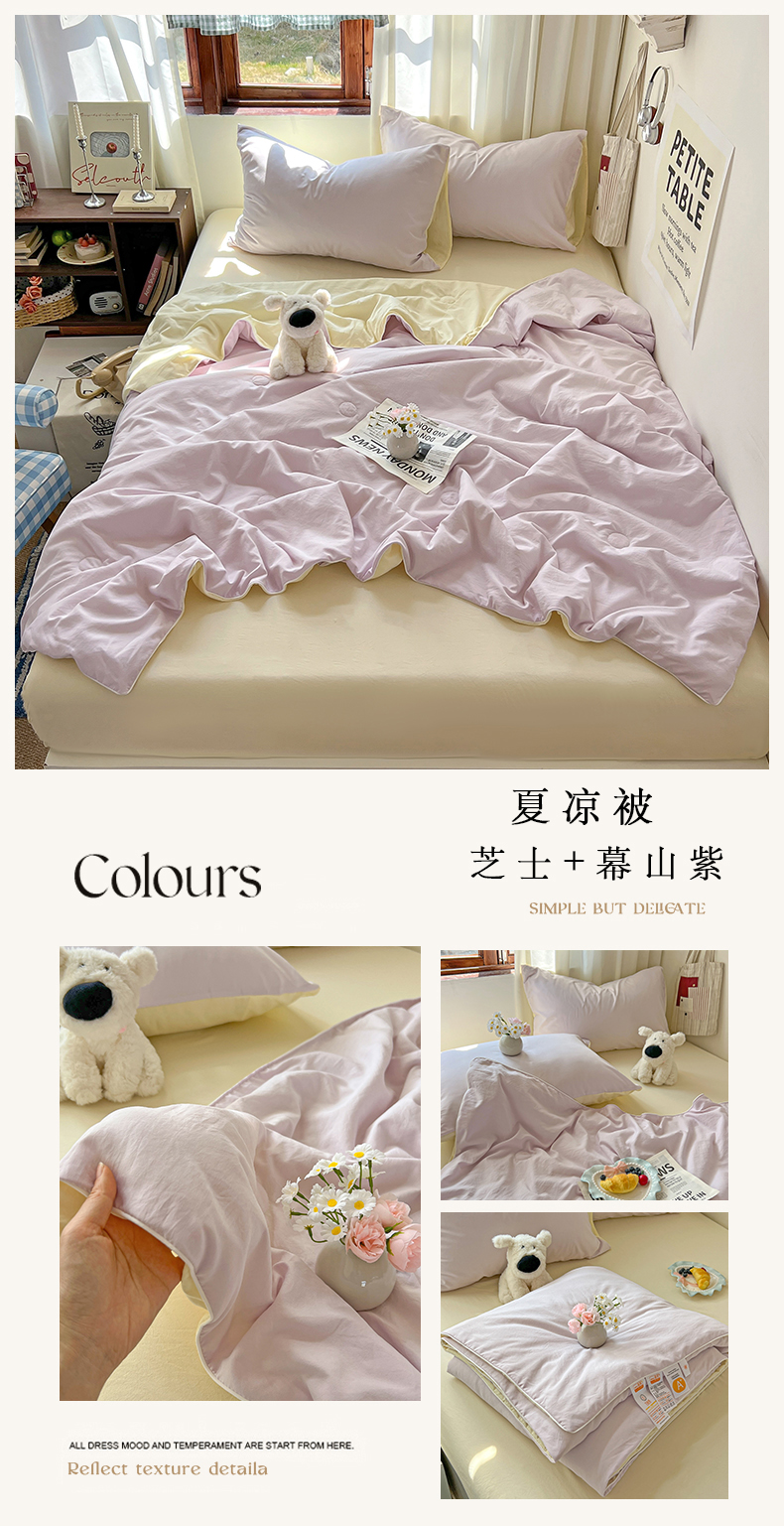 当前位置: 91家纺网 > 商品网购 > 床品套件 > 四件套 > 夏被四件套 > 冕悠家纺 2026春夏新款A类高克重超级无敌柔软水洗棉拼色夏被空调被夏凉被四件套 幕山紫+芝士粉-夏凉被