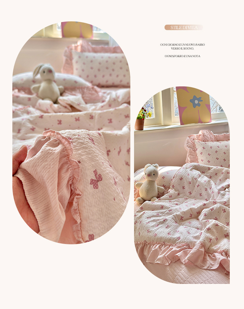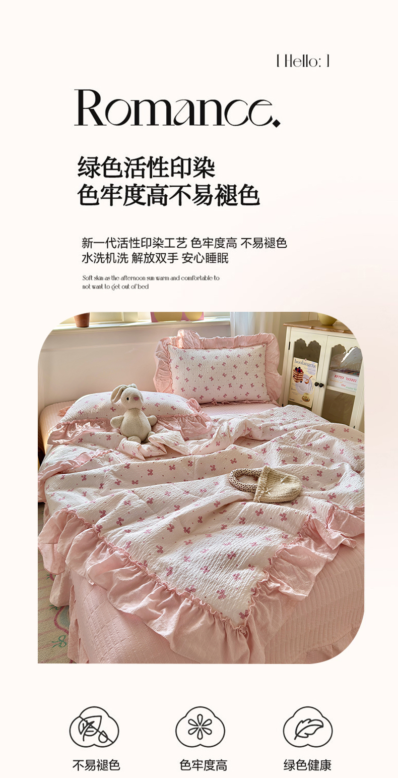 禾沐 2026新款云感泡芙纱全棉蕾丝花边款夏被四件套 田园免,田园免