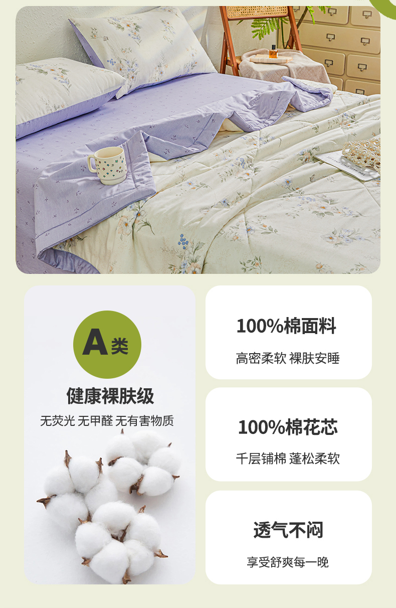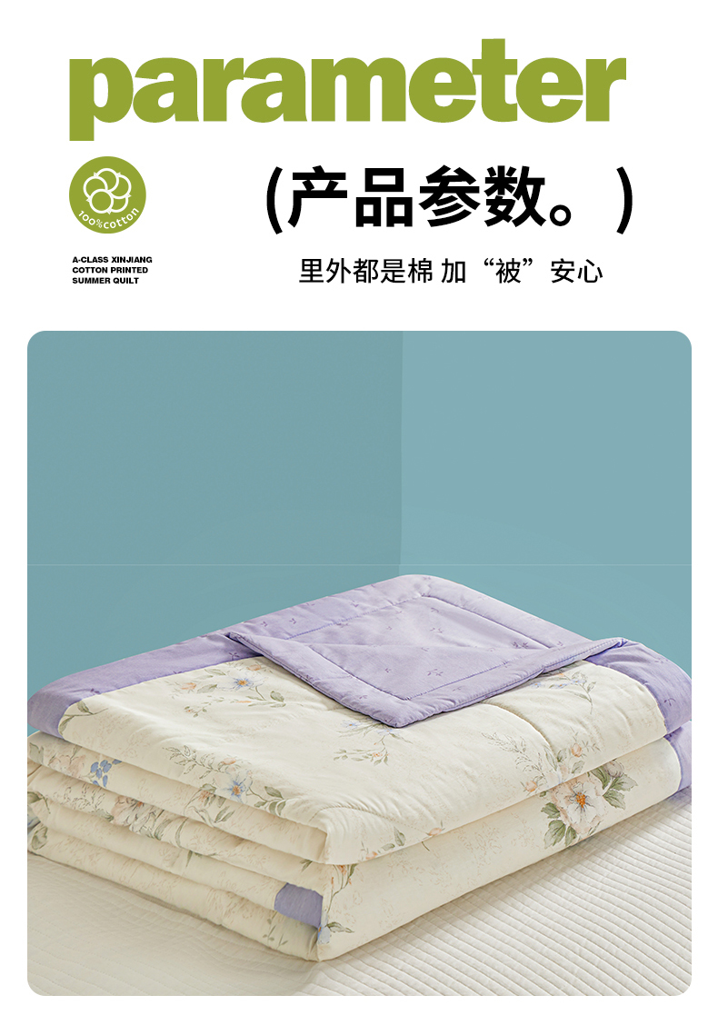 当前位置: 91家纺网 > 商品网购 > 被子 > 夏被 > 小禹仔家纺 2026新款A类里外全棉印花棉花夏被 淡紫花瑶