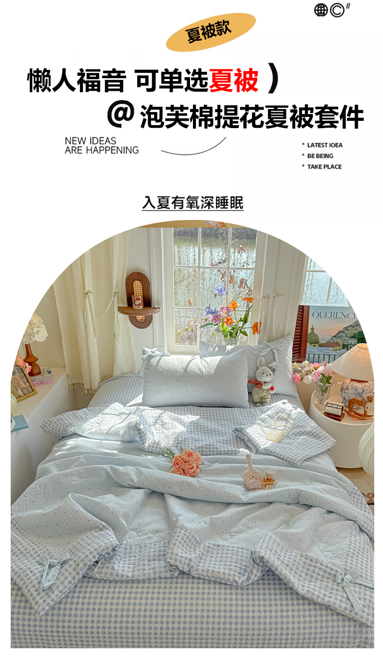 • 91家纺网 家纺一手货源 找家纺 (总)子钦家纺 2026春夏新款提花泡芙棉贴布绣手包边但夏被夏被四件套-丘比特的爱恋(场景二),丘比特的爱恋-海盐蓝+蓝格,丘比特的爱恋-奶粉波点+粉小格,丘比特的爱恋-奶红波点+红格,丘比特的爱恋-奶灰波点+黑小格,组合图