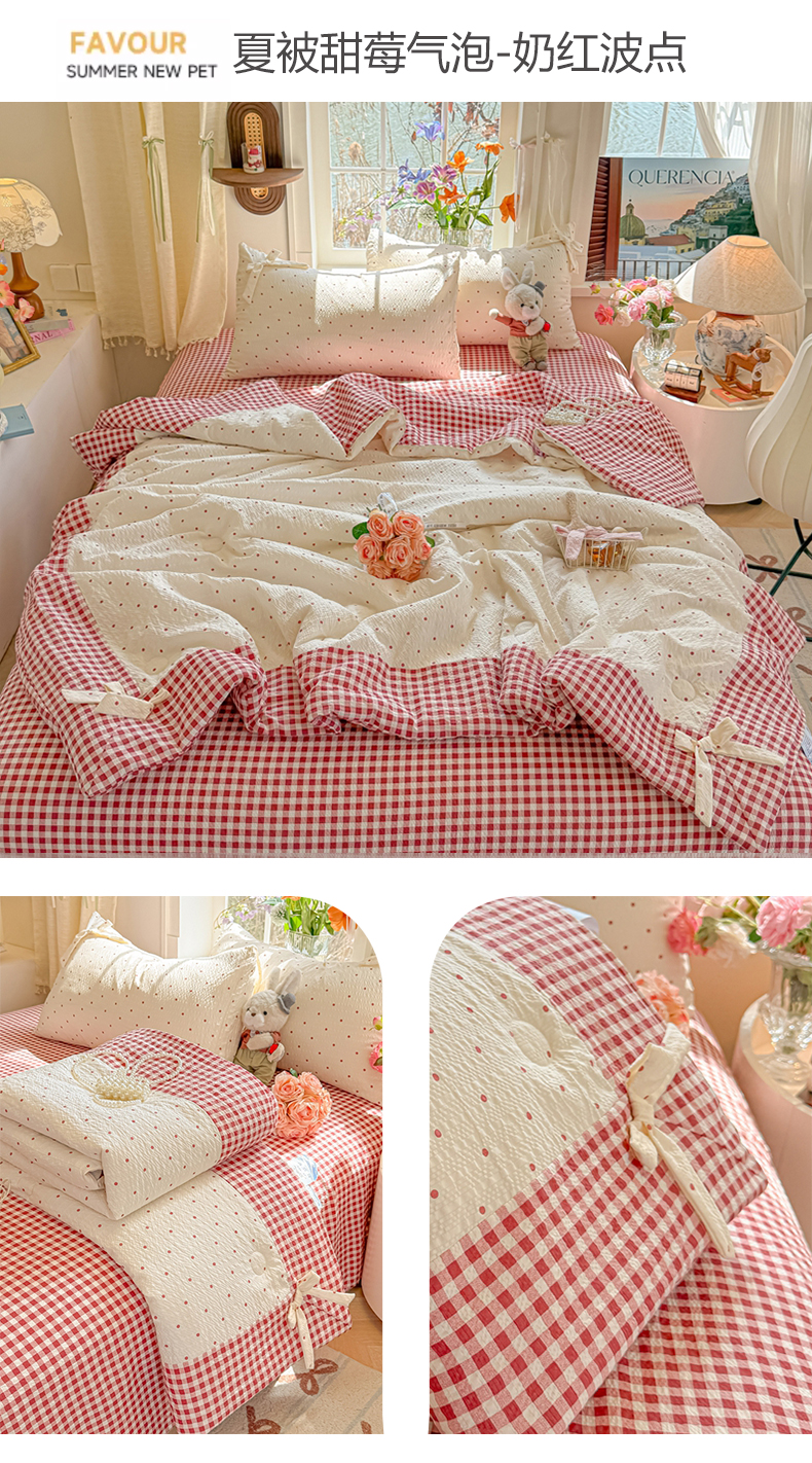 • 91家纺网 家纺一手货源 找家纺 (总)子钦家纺 2026春夏新款提花泡芙棉拼角蝴蝶结软乎乎的撸猫感单夏被夏被四件套-甜莓气泡