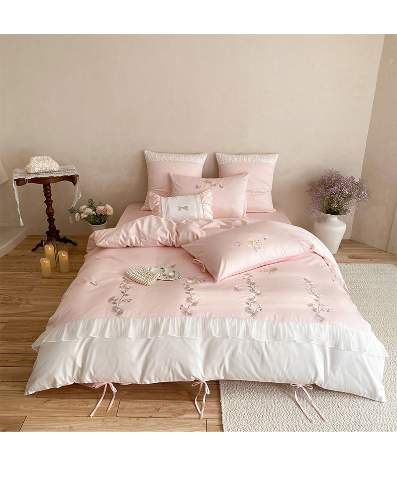 (总)树下 2026新款100支50S双股 刺绣A类高支高密贡缎长绒棉四件套-花信,花信粉,花信紫