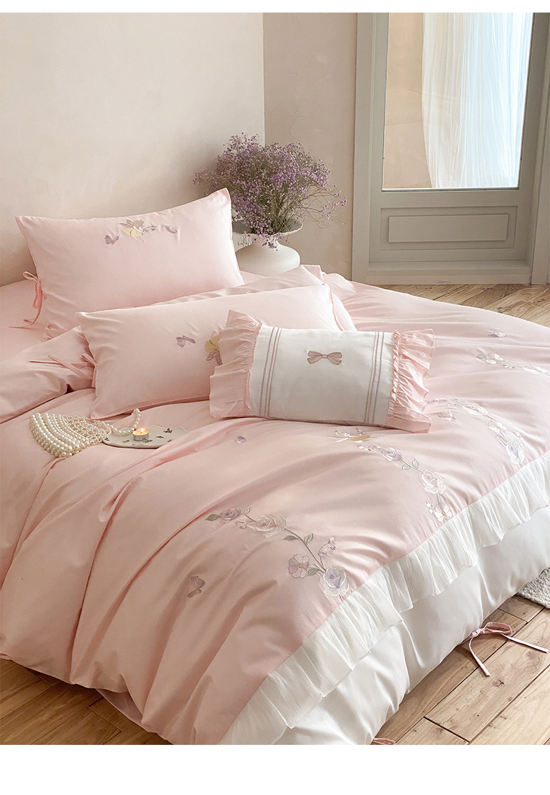 树下 2026新款A类100支50S双股刺绣高支高密贡缎长绒棉四件套-柔堇 柔堇-粉,柔堇-粉