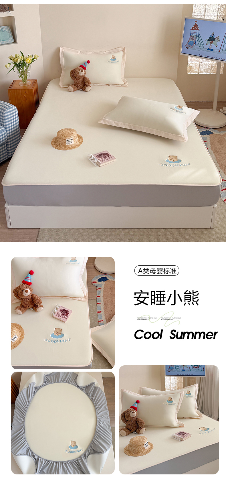 (总)Sweet dreams甜梦 2026新款夏款A类锦氨卡通刺绣立体床笠款凉感席,安睡小熊,布噜海马,春日小兔,乐萌小象,组合