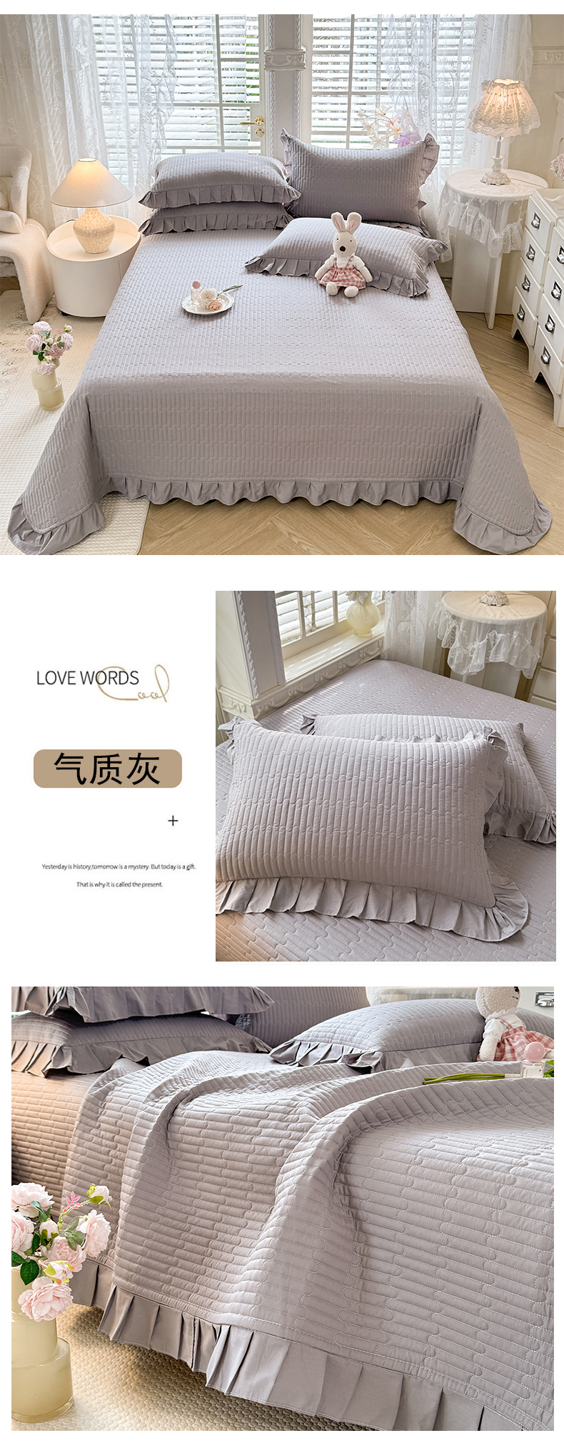 (总)花香四季家纺 2026新款13376全棉夹棉床盖三件套13372纯棉纯色床盖花边公主风(可定制任意尺寸),薄荷绿,清新蓝,奶酪黄,气质灰,甜心粉,豆沙色,暮林绿,荔枝粉,象牙白,芝士黄,组合图