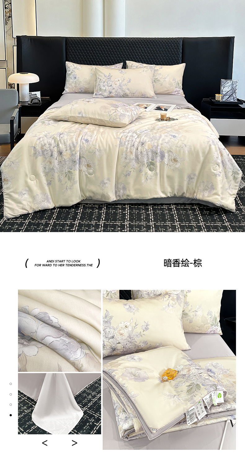 • 91家纺网 家纺一手货源 找家纺 (总)尊妙被业 2026春夏新款莱赛尔天丝夏被蚕蛹蛋白夏被夏凉被空调被四件套-印花款,暗香绘-棕,花颜外-蓝,林屿间-粉,林语花夏-米,柳语素枝-绿,蔓行-绿,沐初-兰,叶间绒雪-兰,自然低语-绿