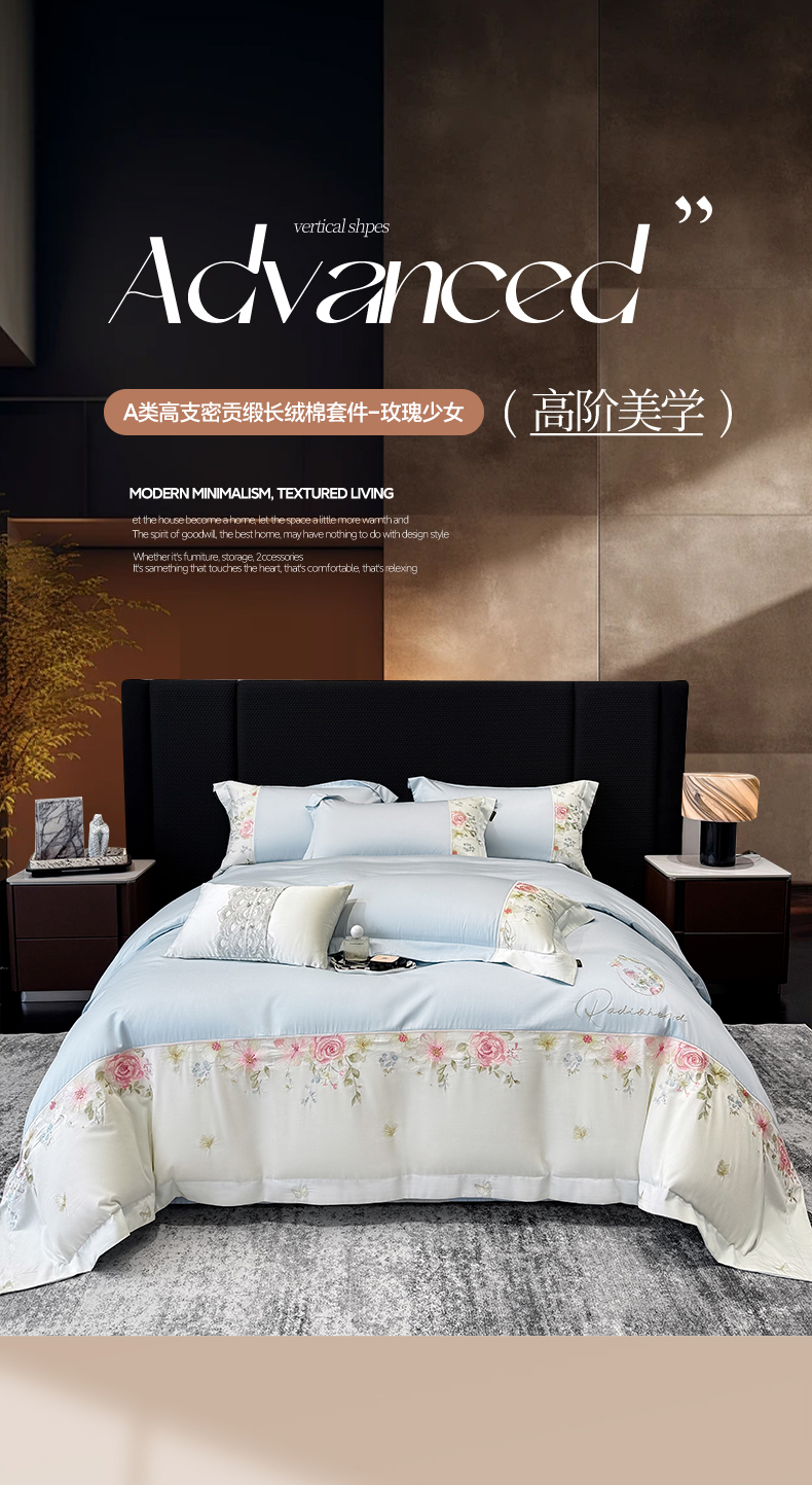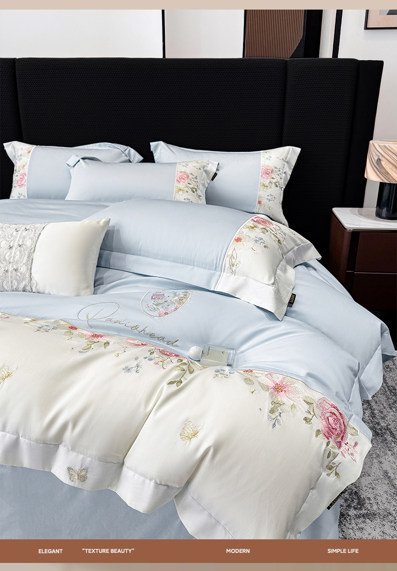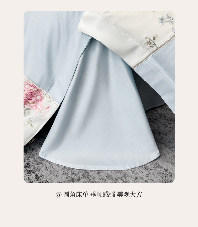 莱势 2026新品100支全棉纯棉50x50s贡缎长绒棉刺绣绣花四件套高端礼盒-玫瑰少女 玫瑰少女 天空蓝