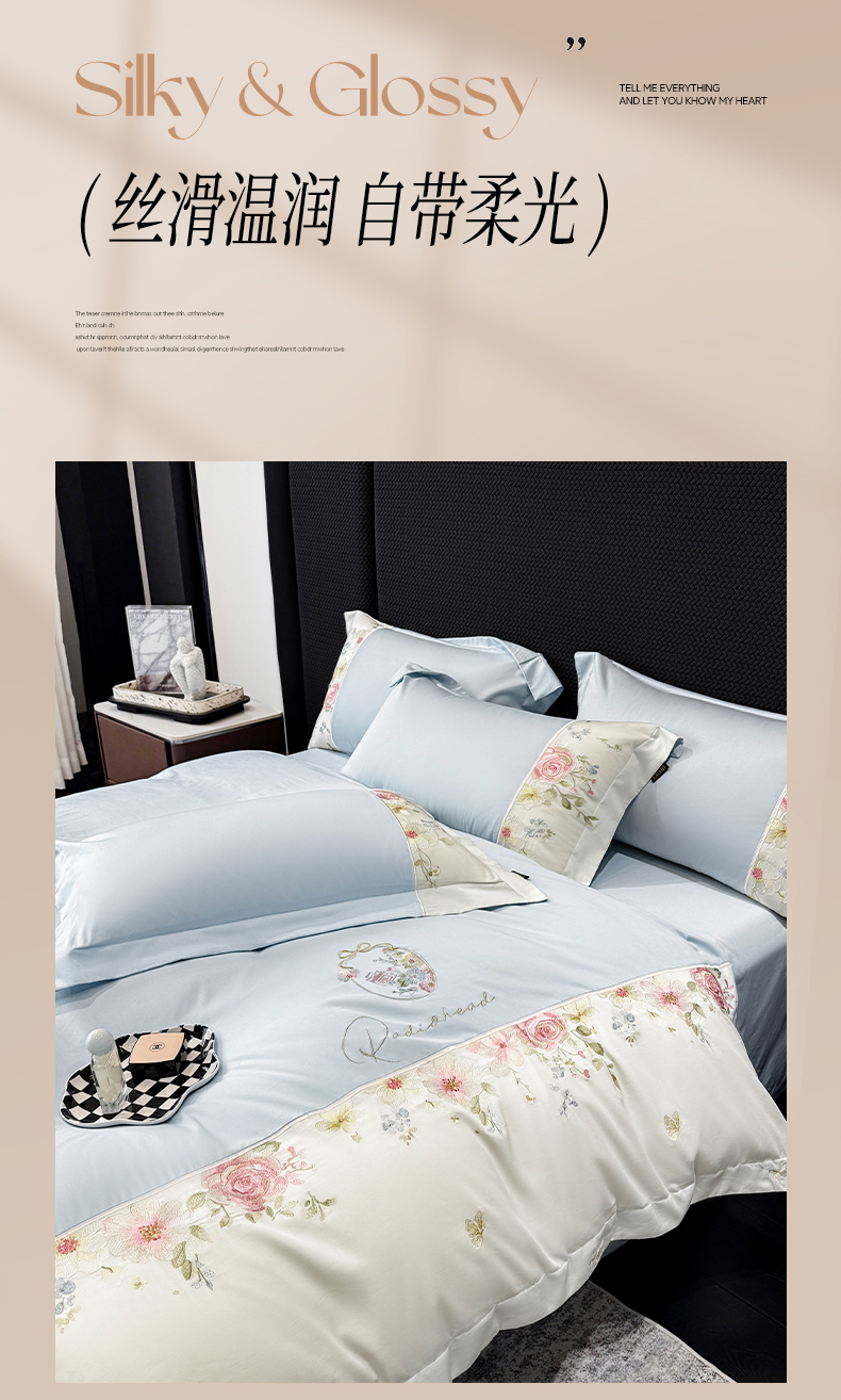 (总)莱势 2026新品100支纯棉全棉50x50s贡缎长绒棉刺绣绣花四件套高端礼盒-花影,花影-轻奢粉,花影-天空蓝,花影-香芋紫