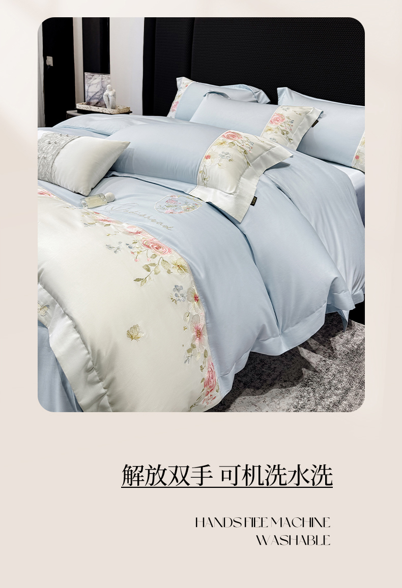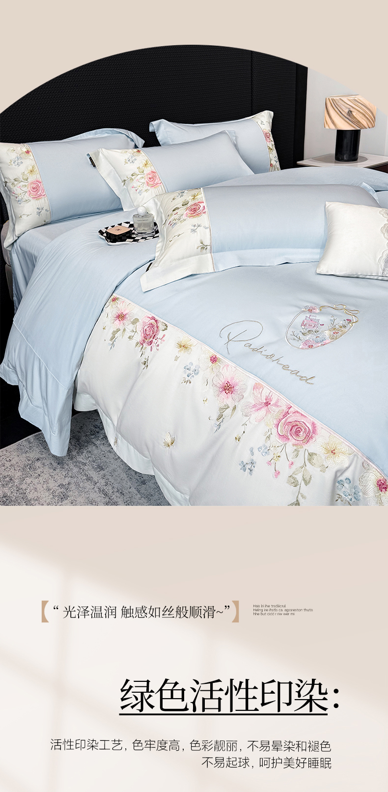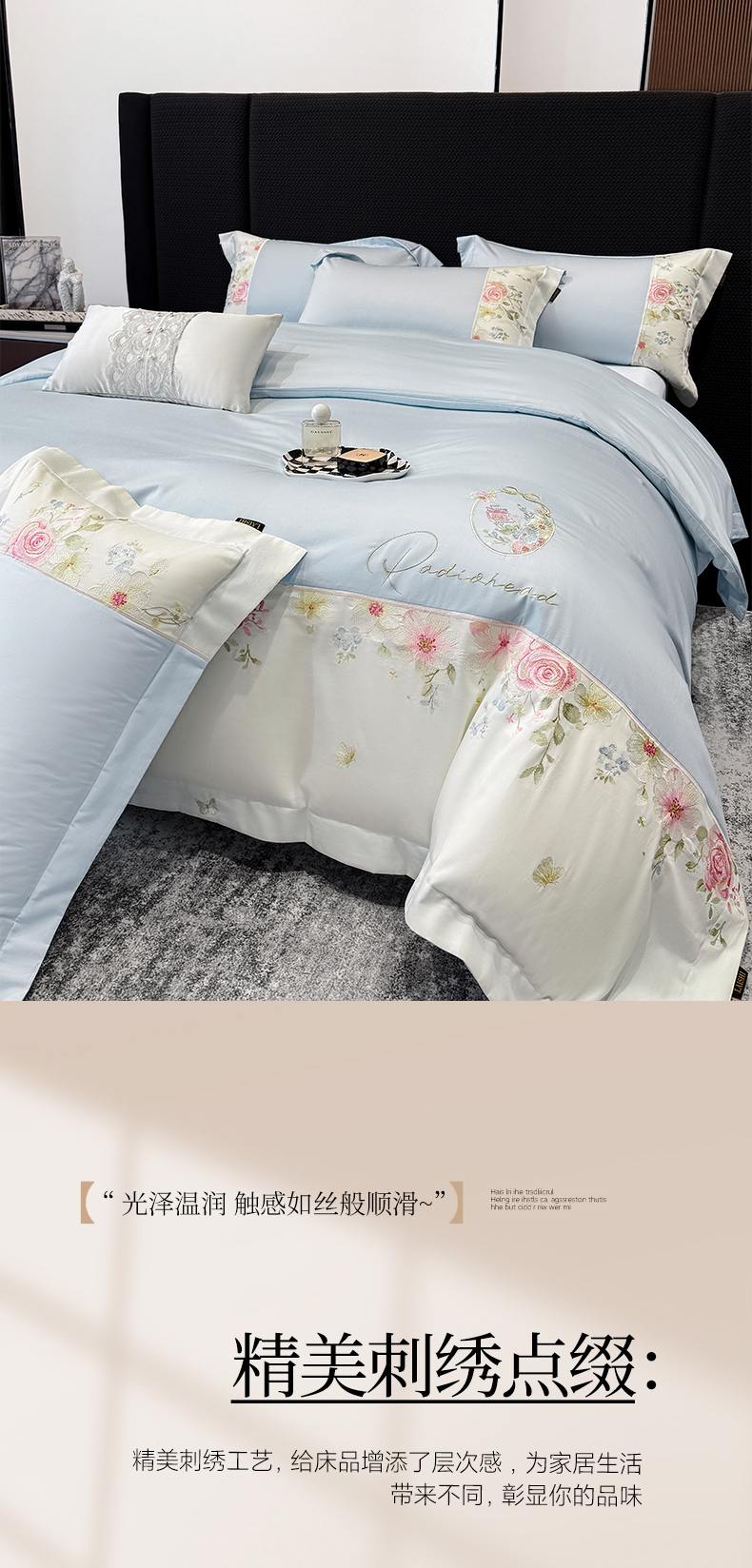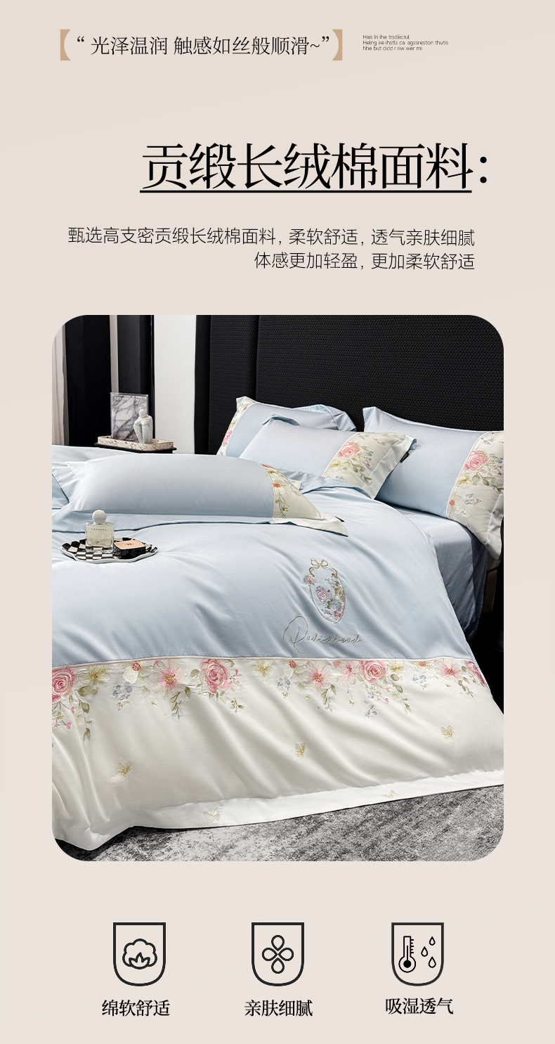 (总)莱势 2026新款100支全棉纯棉50x50s埃及贡缎长绒棉刺绣绣花四件套高端礼盒-花开半夏系列,花开半夏-天空蓝,花开半夏-绿野仙踪,花开半夏-轻奢粉