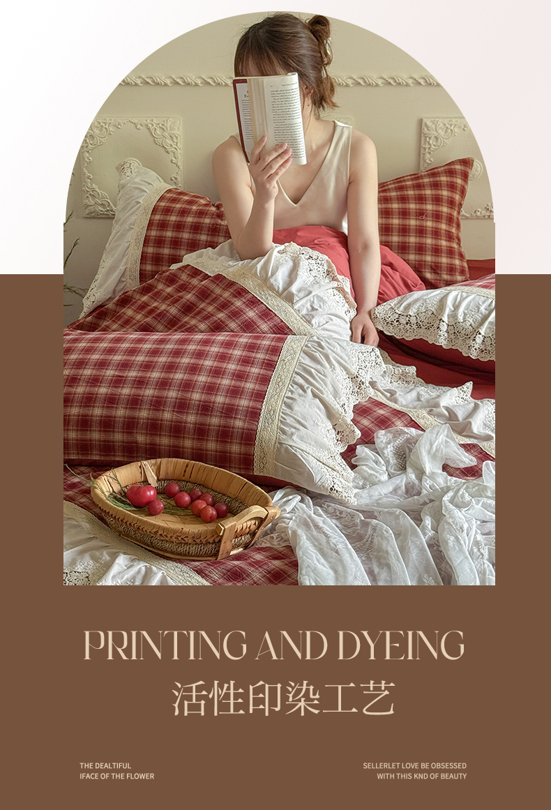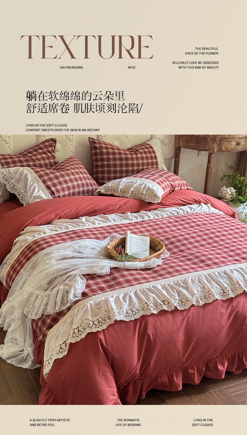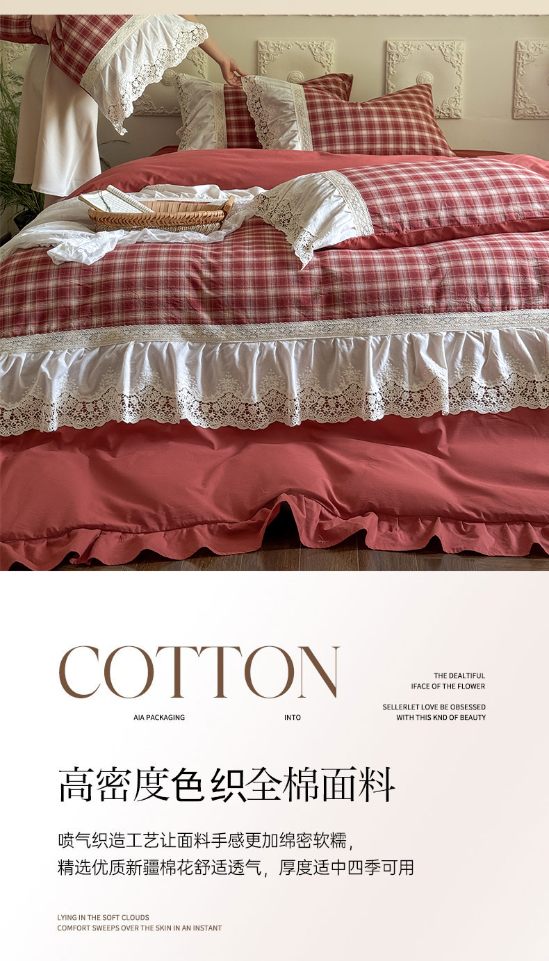 (总)花香四季家纺 2026新款法式全棉色织花边床裙款纯棉水洗棉四件套-法式庄园,法式庄园-复古红,法式庄园-复古咖