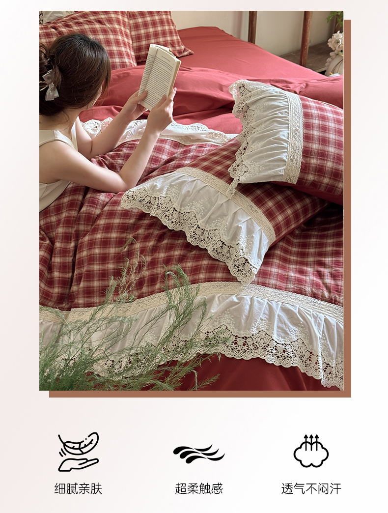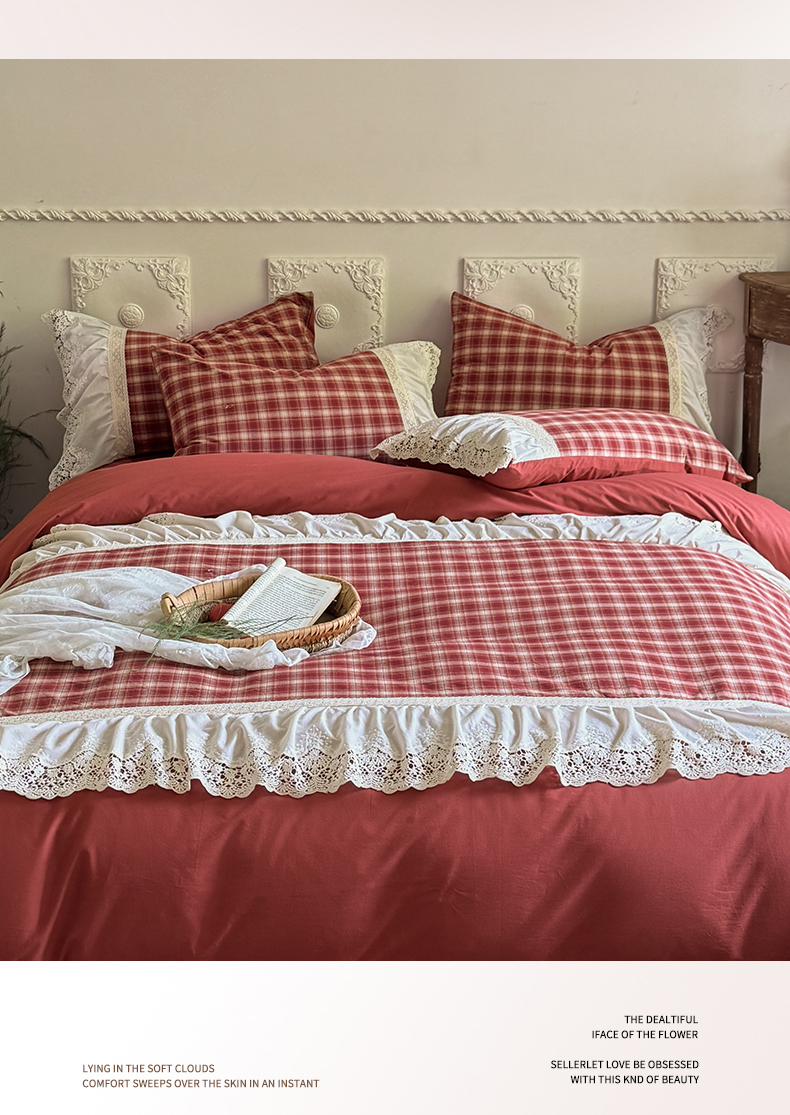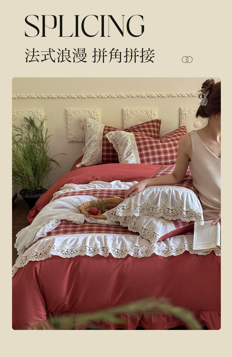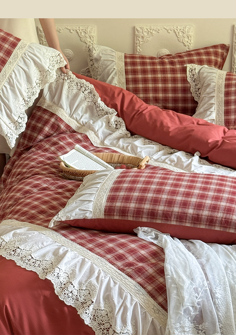 (总)花香四季家纺 2026新款法式全棉色织花边床裙款纯棉水洗棉四件套-法式庄园,法式庄园-复古红,法式庄园-复古咖