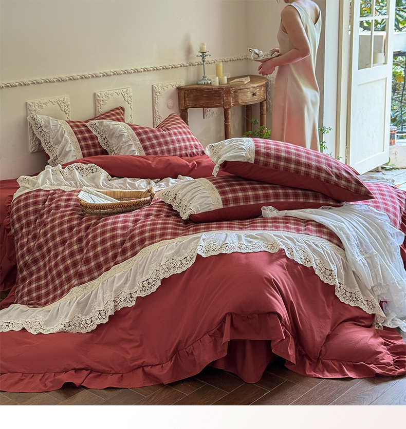 花香四季家纺 2026新款法式全棉色织花边床裙款纯棉水洗棉四件套-法式庄园 法式庄园-复古红