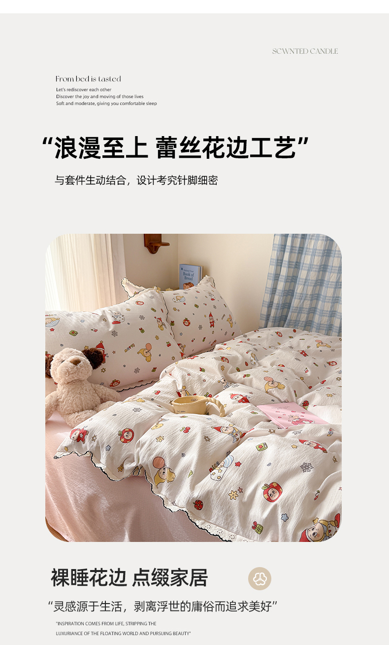 商品名称:温眠家纺 2026新款针织提花双层纱全棉蕾丝花边四件套 苹果星人