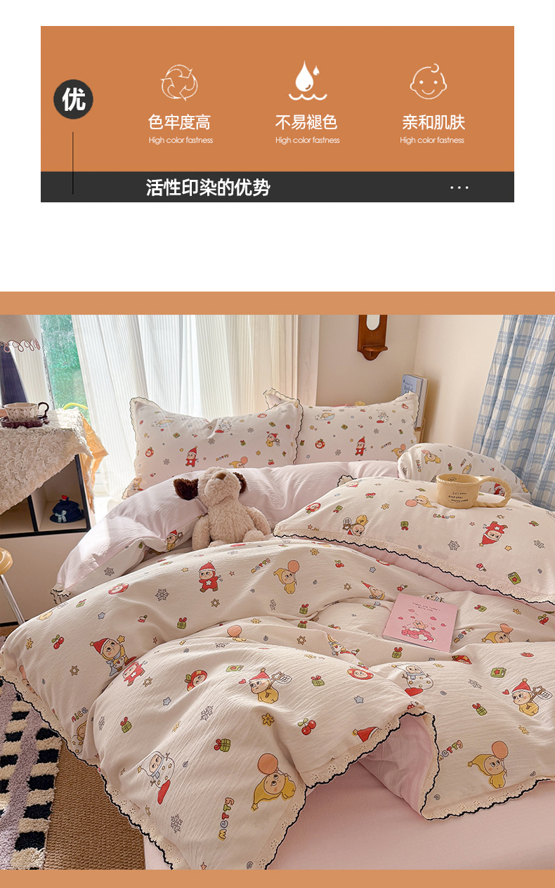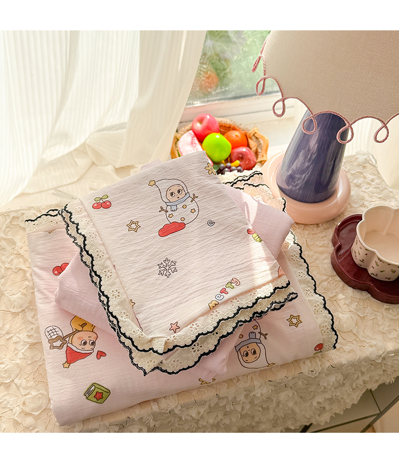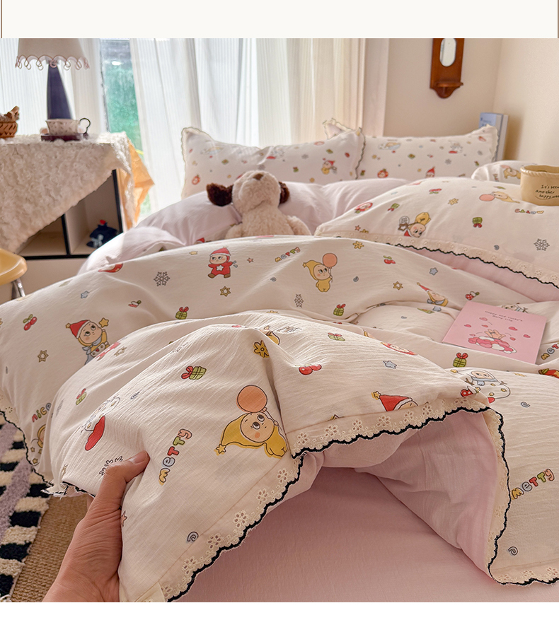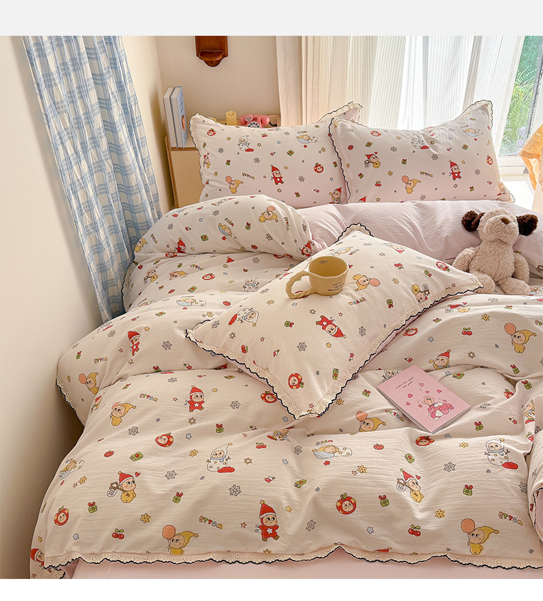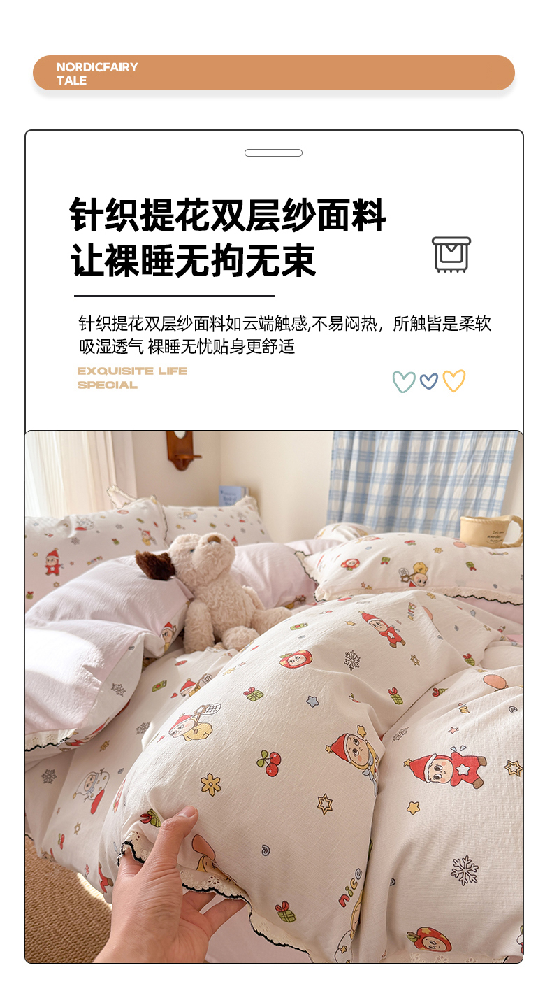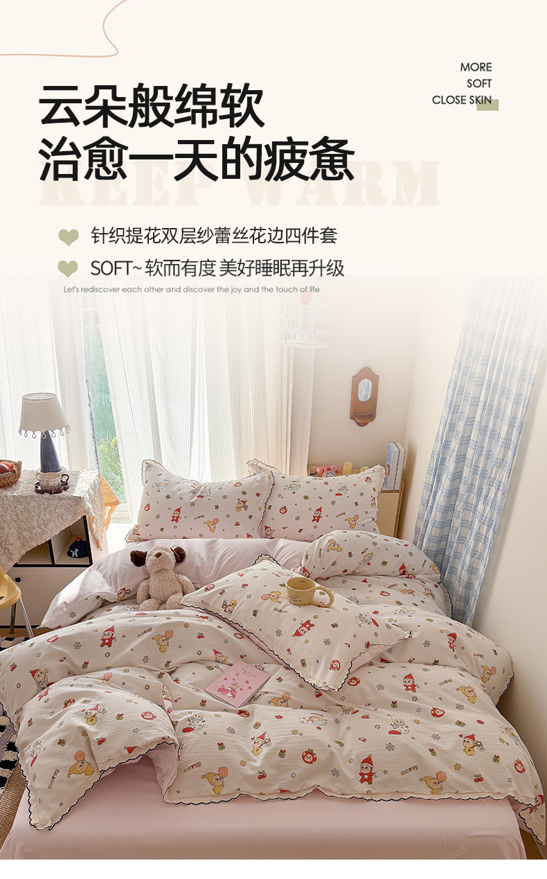 温眠家纺 2026新款针织提花双层纱全棉蕾丝花边四件套 苹果星人