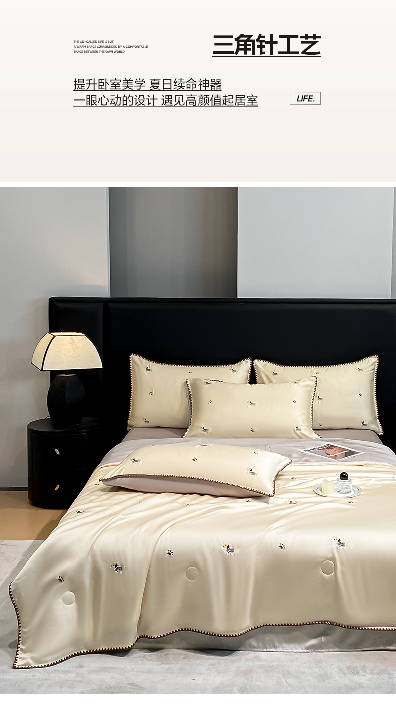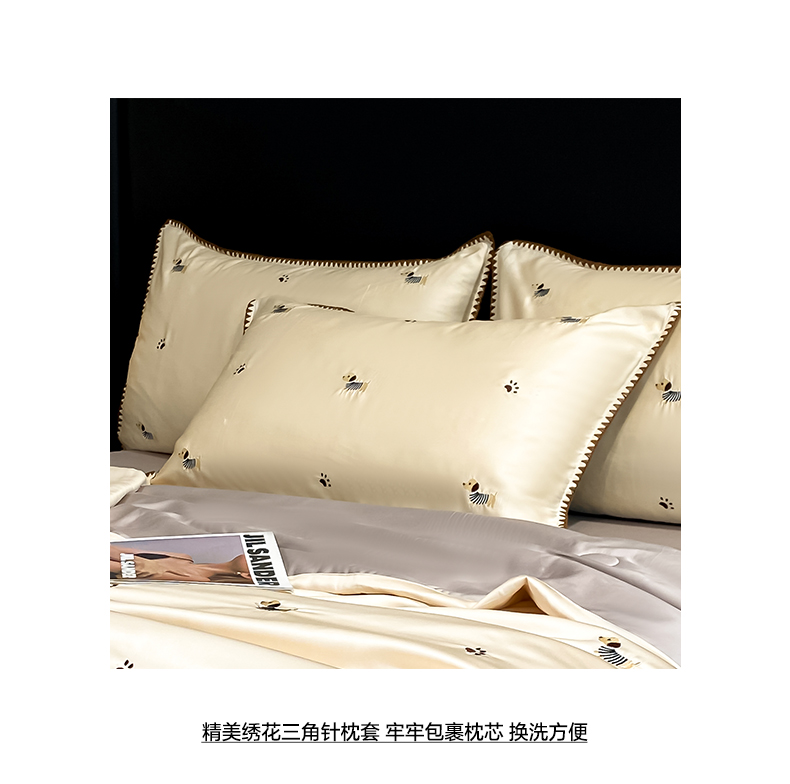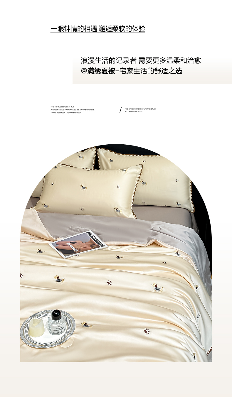 • 91家纺网 家纺一手货源 找家纺 如一 2026新款水洗冰丝刺绣三角针工艺夏被四件套 腊肠犬-杏灰