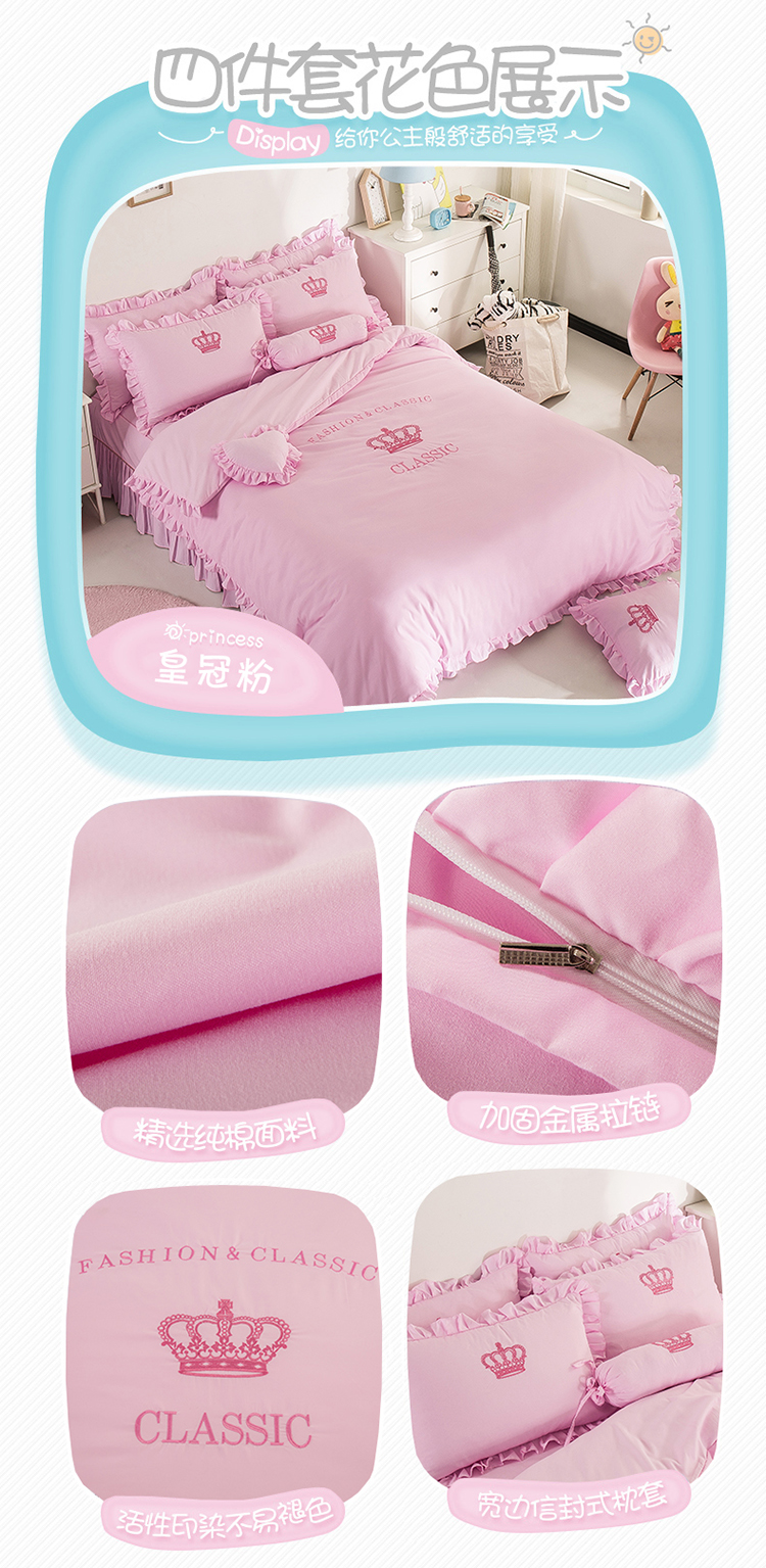 当前位置: 91家纺网 > 商品网购 > 床品套件 > 四件套 > 水洗棉四件套 > 欧冠家纺 水洗磨毛卡通床裙款四件套 皇冠粉