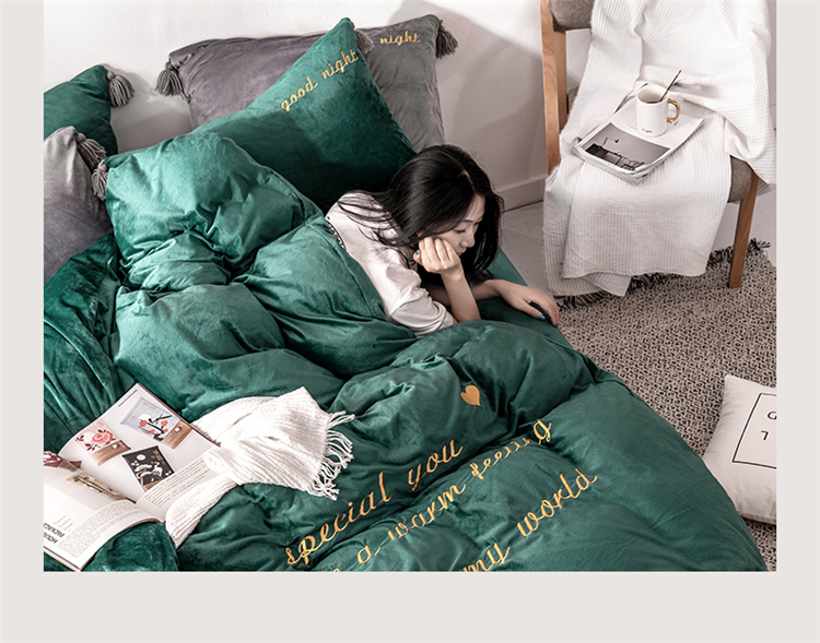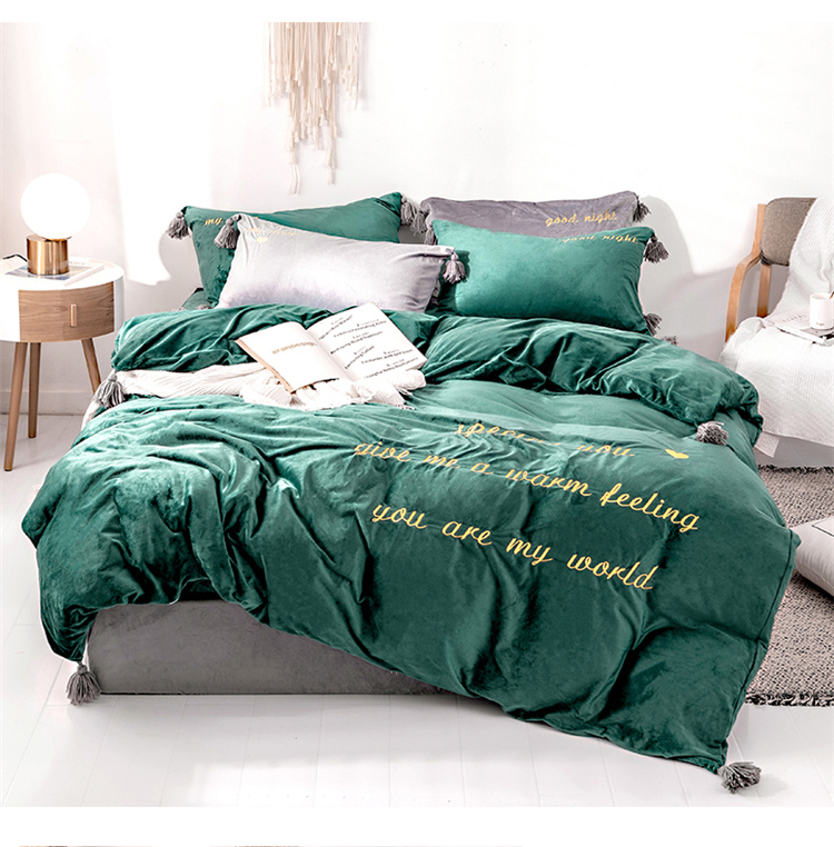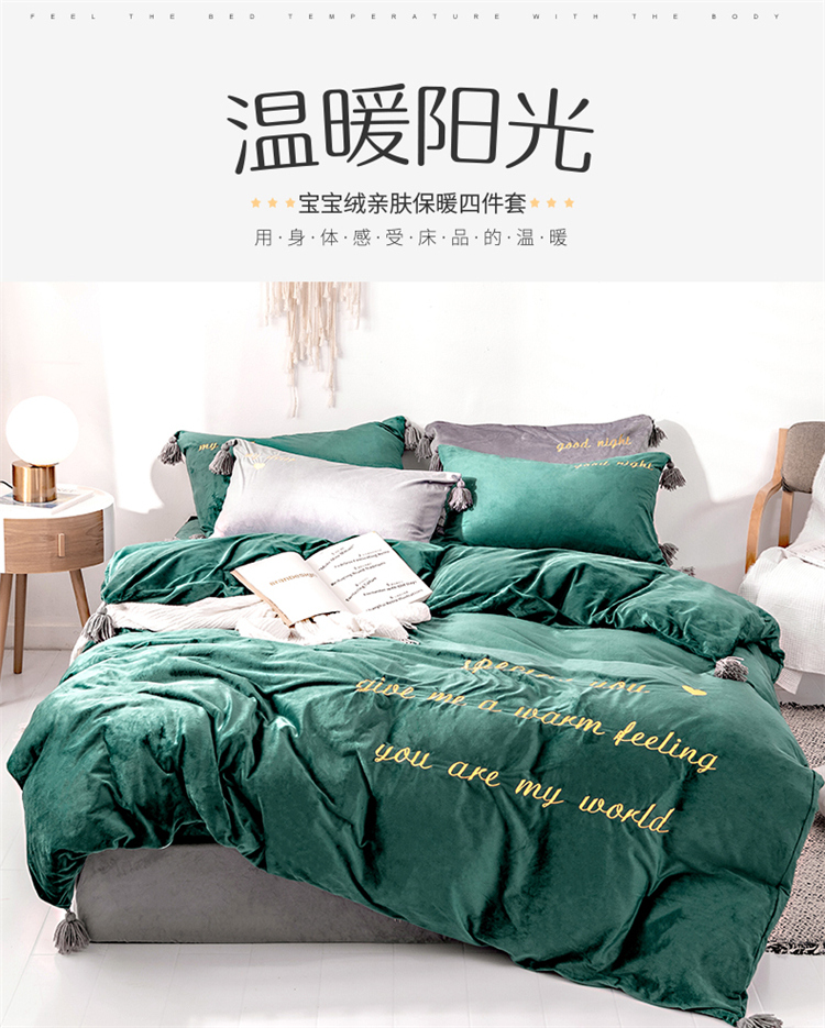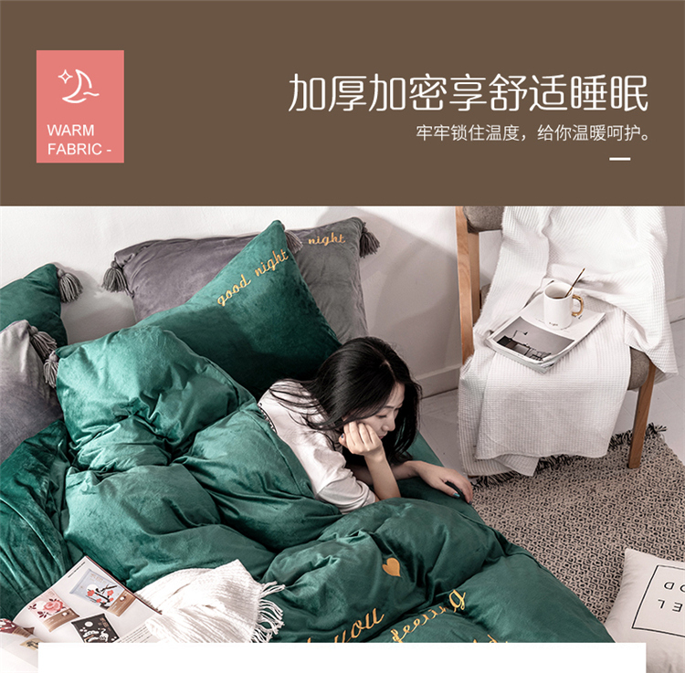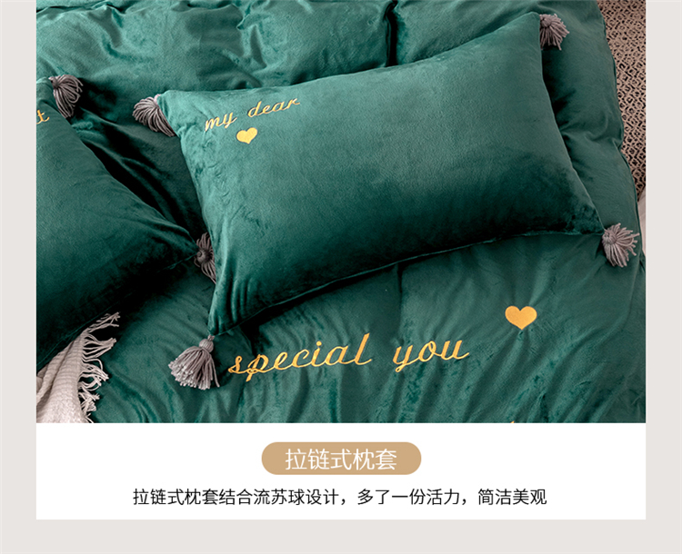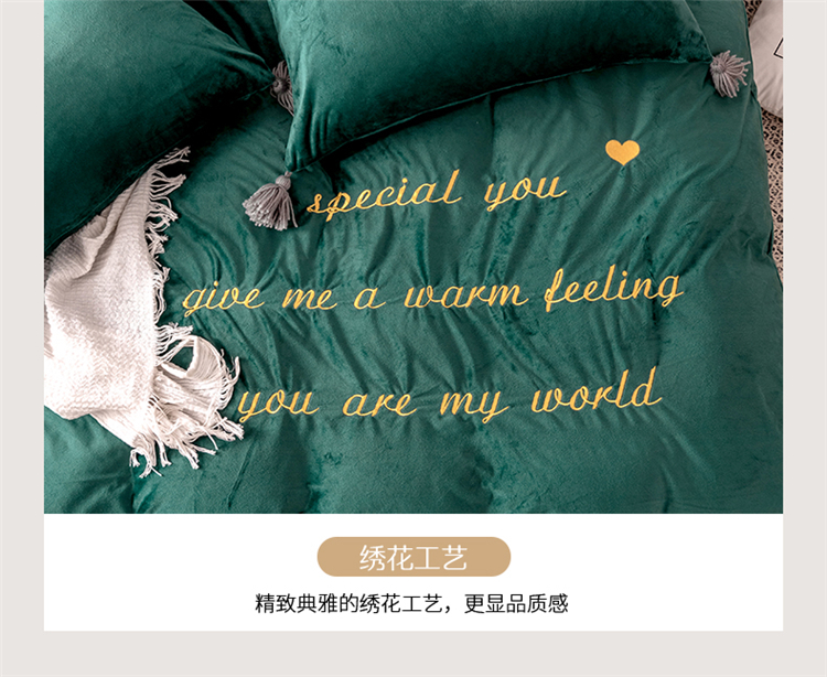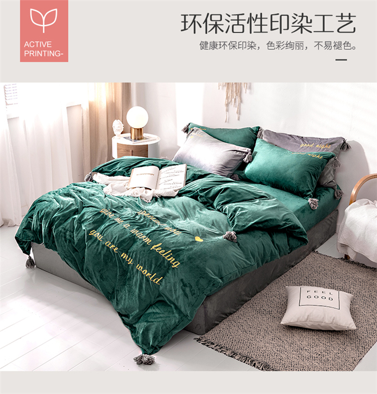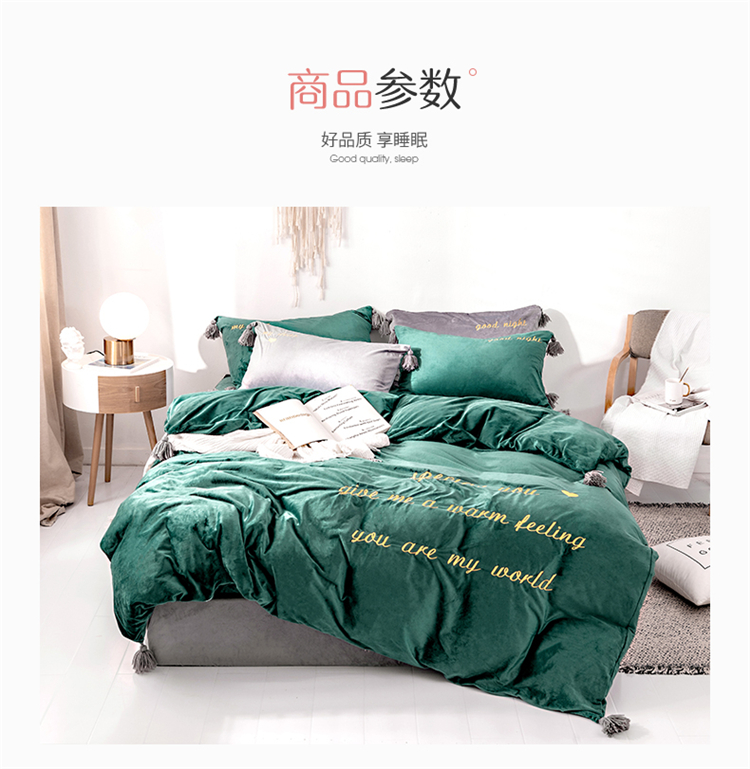 商品名称:北纬27度 2019新款流苏刺绣加厚宝宝绒四件套 缠绵墨绿