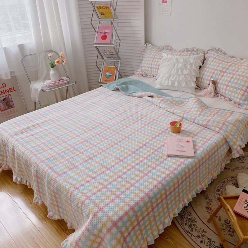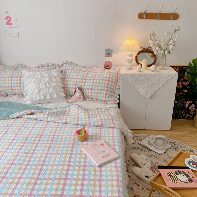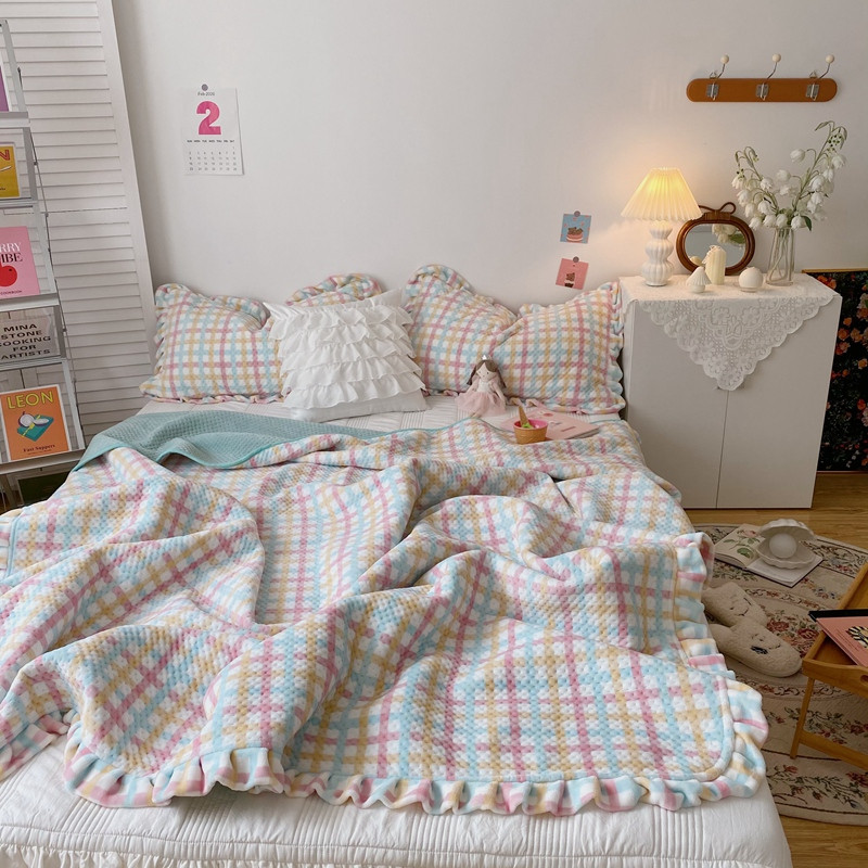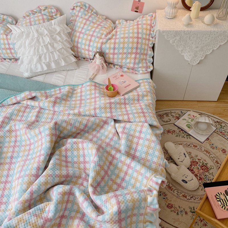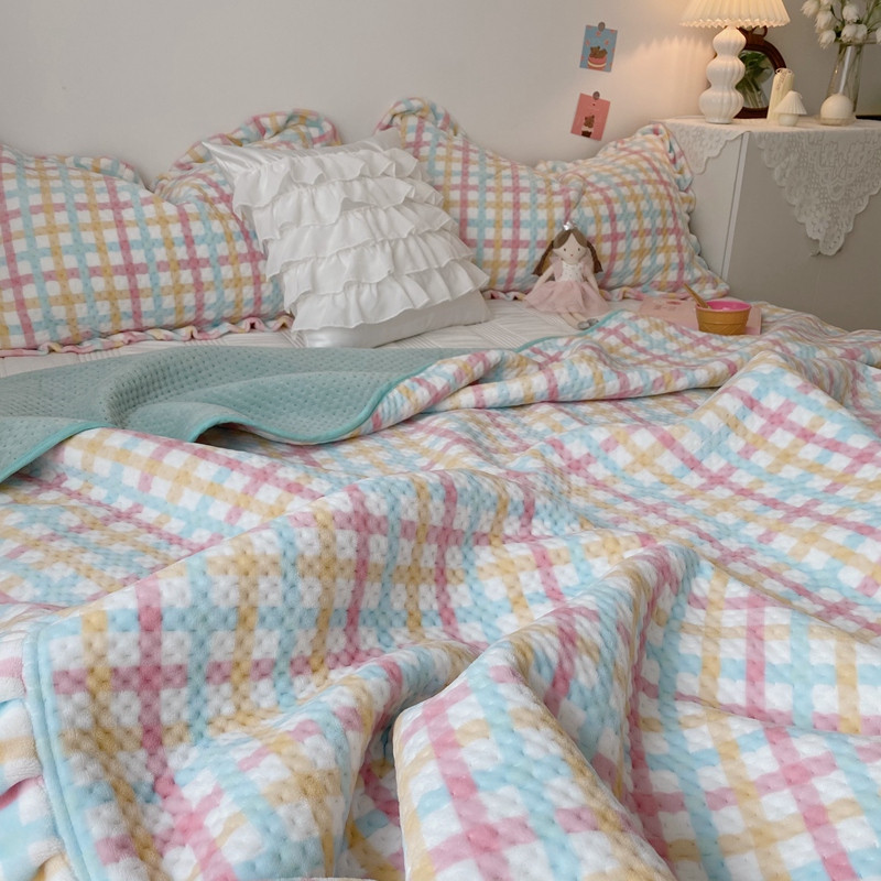 星期八 2020新款奶油色花边牛奶绒床盖 格子绿