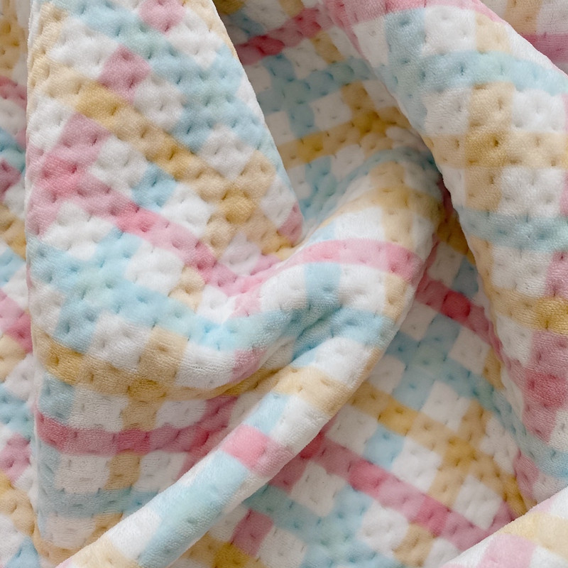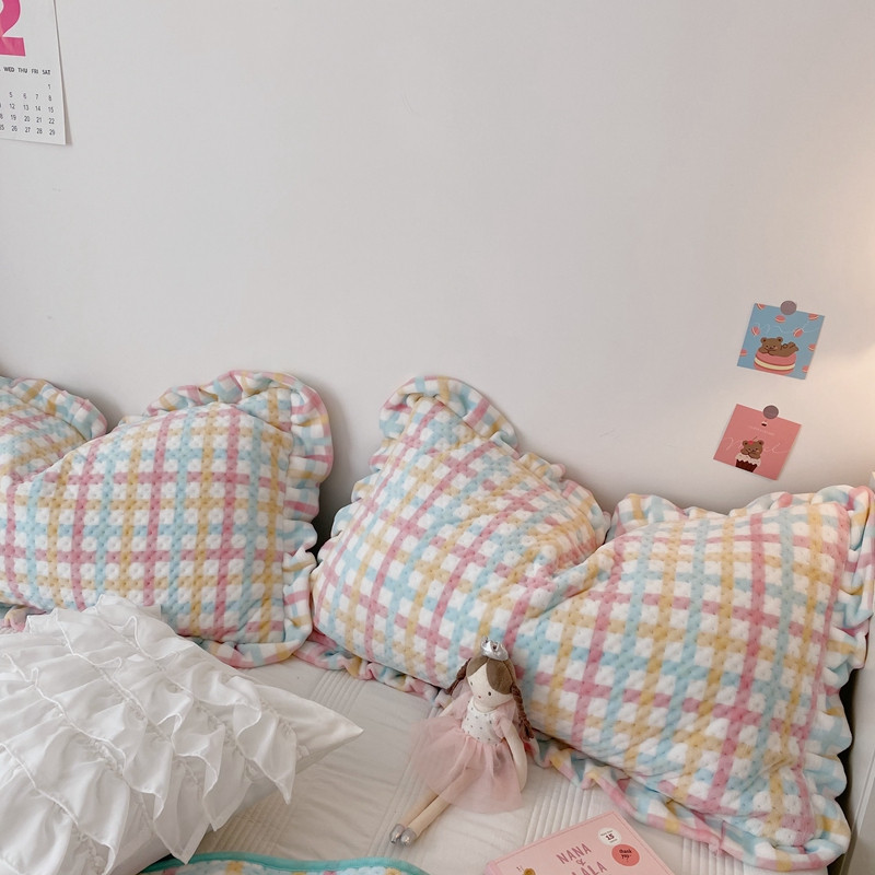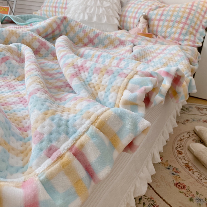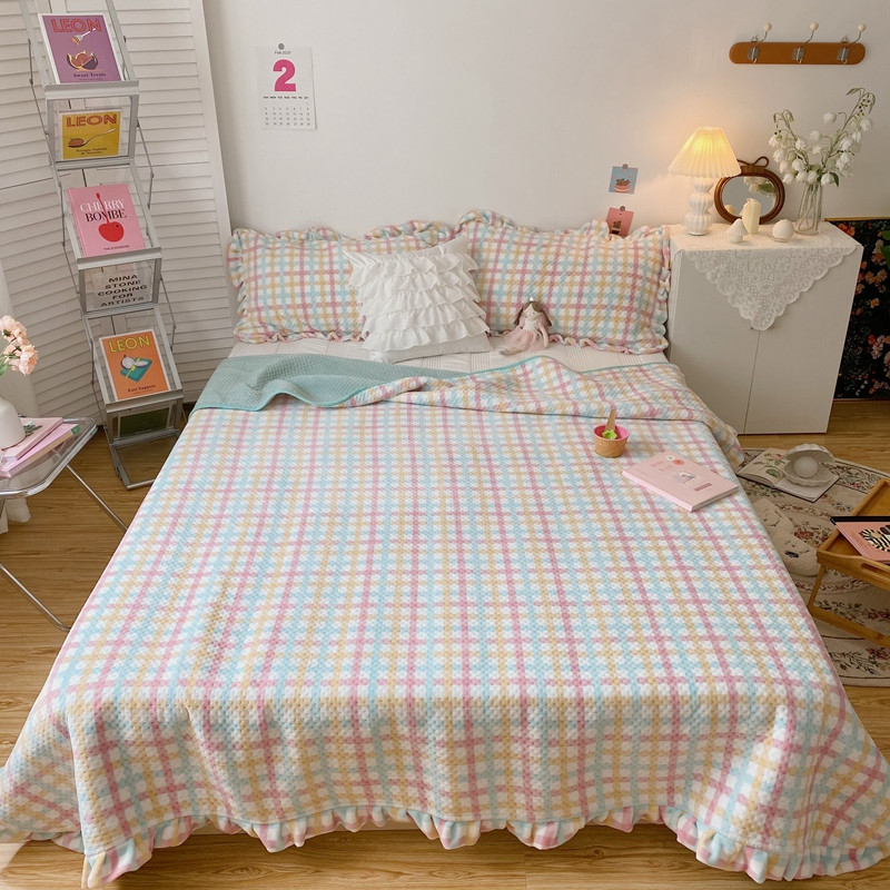 商品名称:星期八 2020新款奶油色花边牛奶绒床盖 格子绿