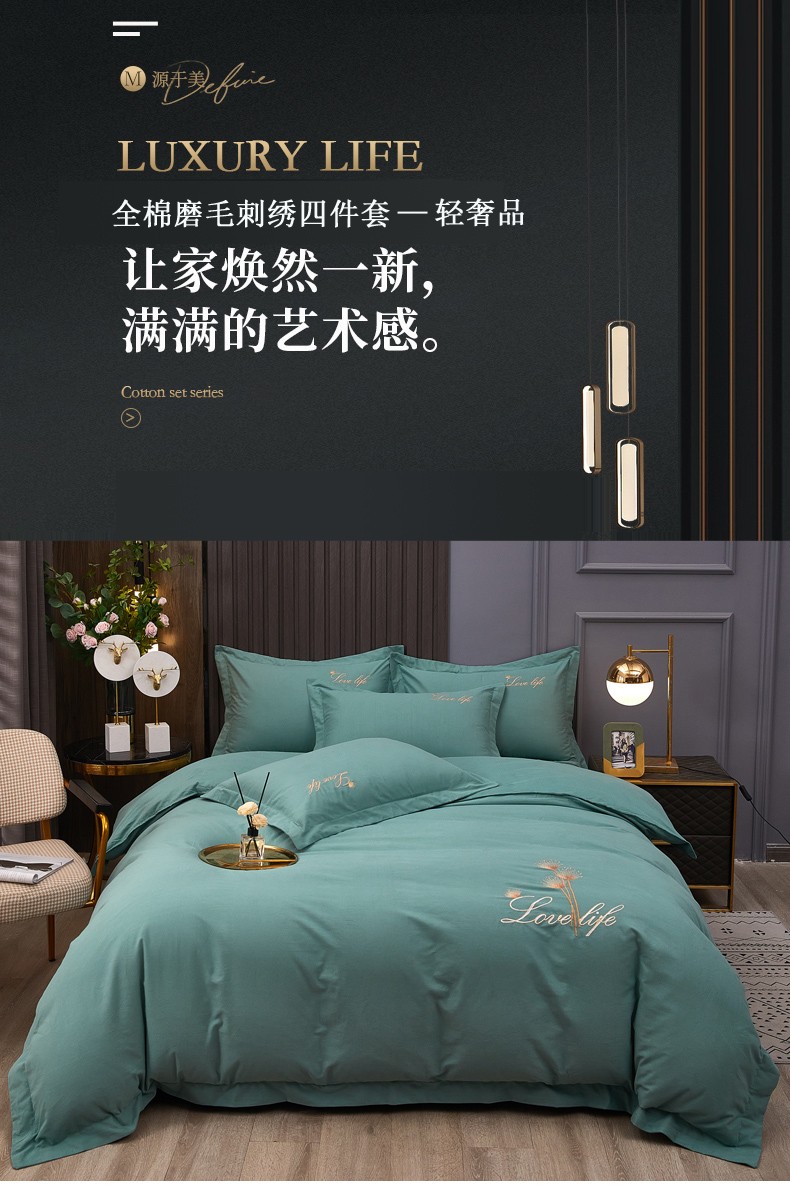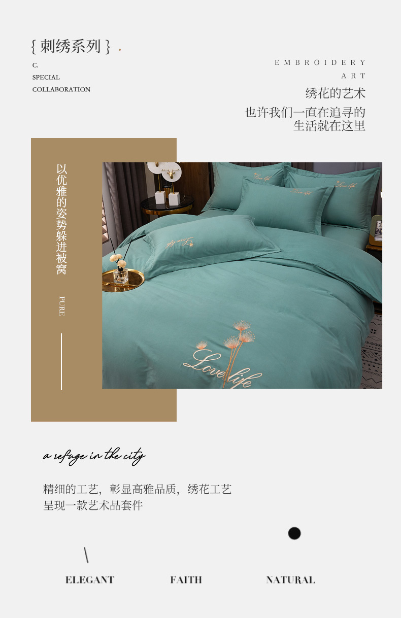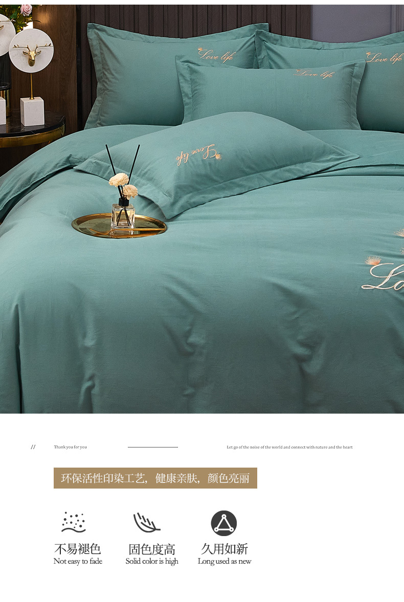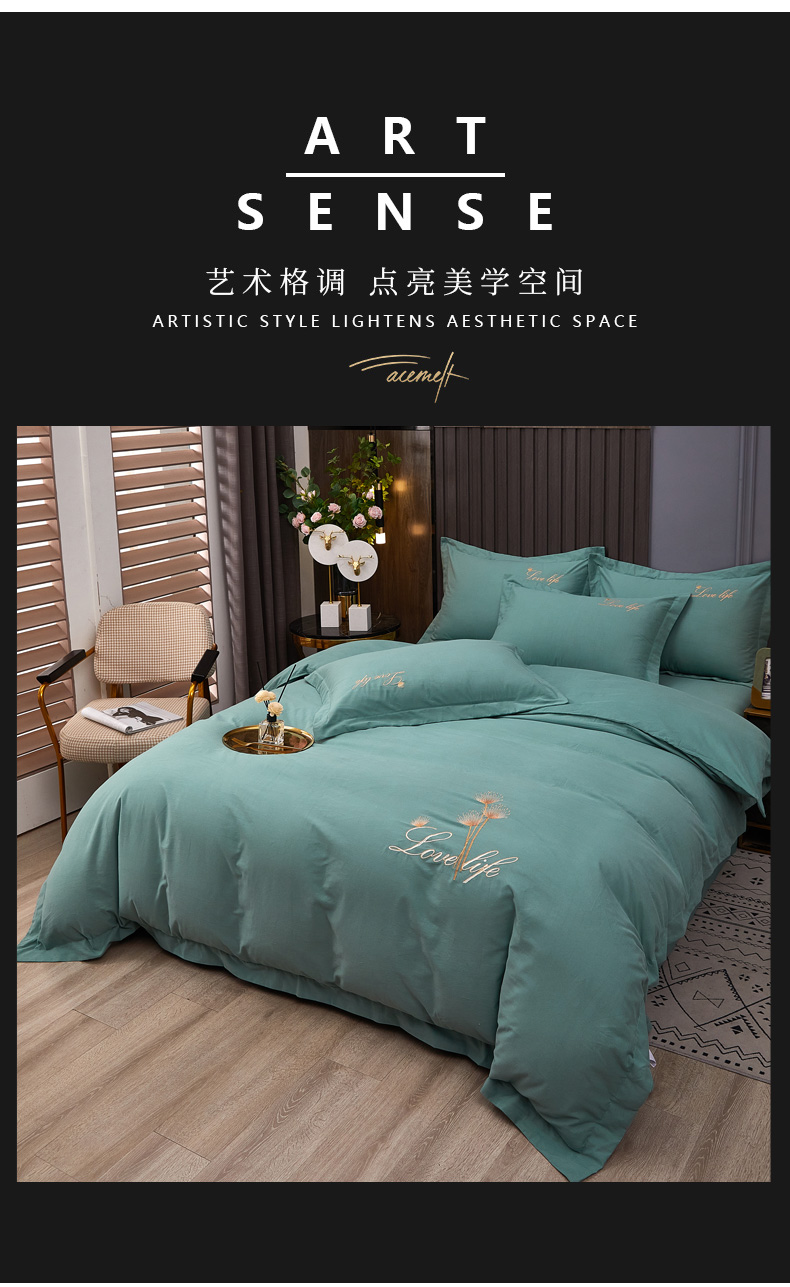 芊寻 2024新款60支全棉磨毛绣花四件套 三叶草 抹茶绿