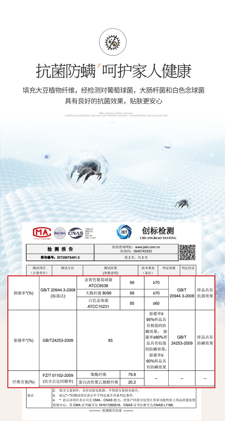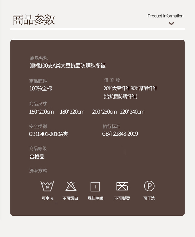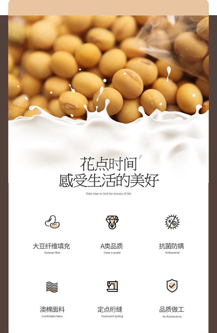 • 填充纤维种类: 大豆蛋白改性聚酯纤维