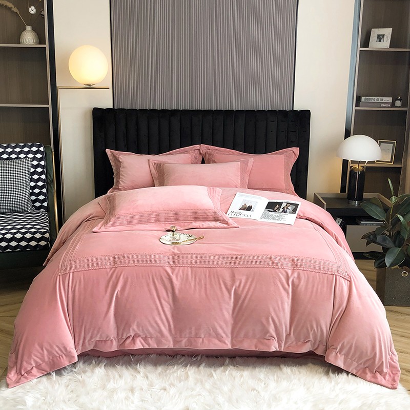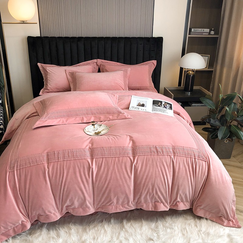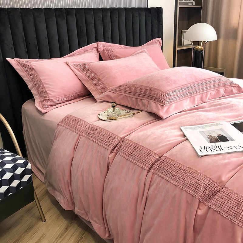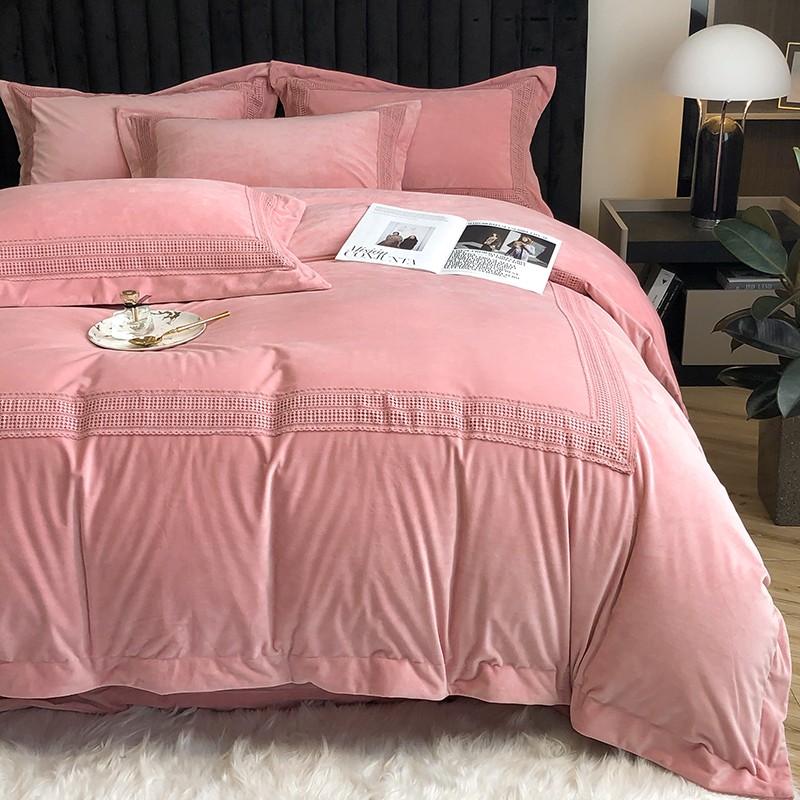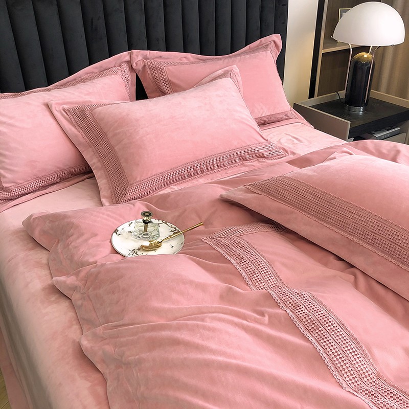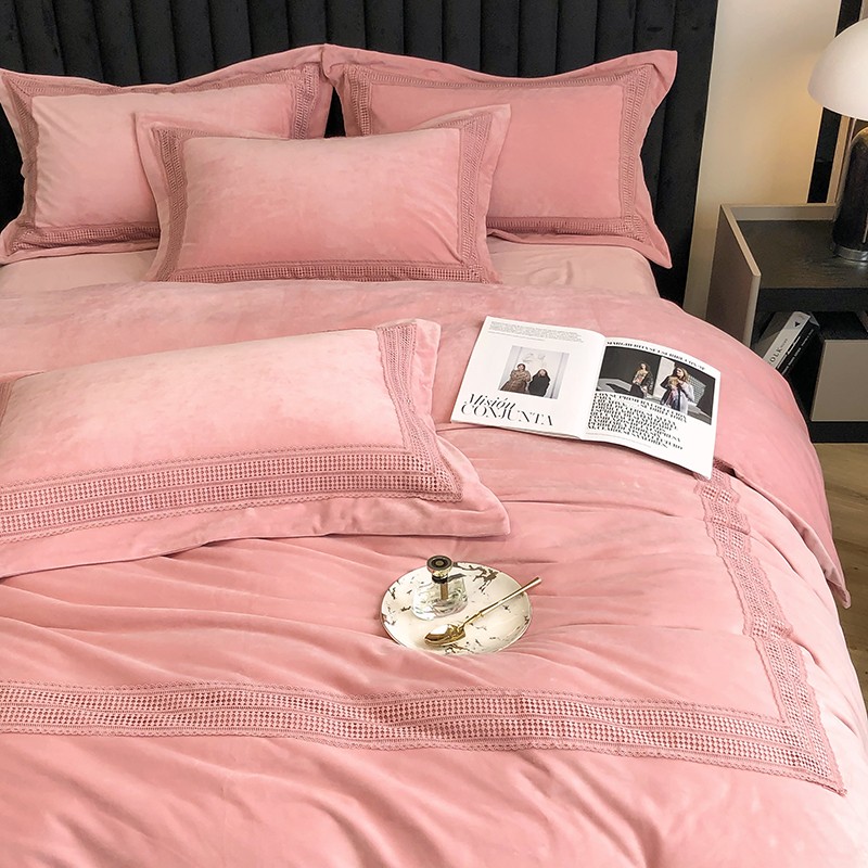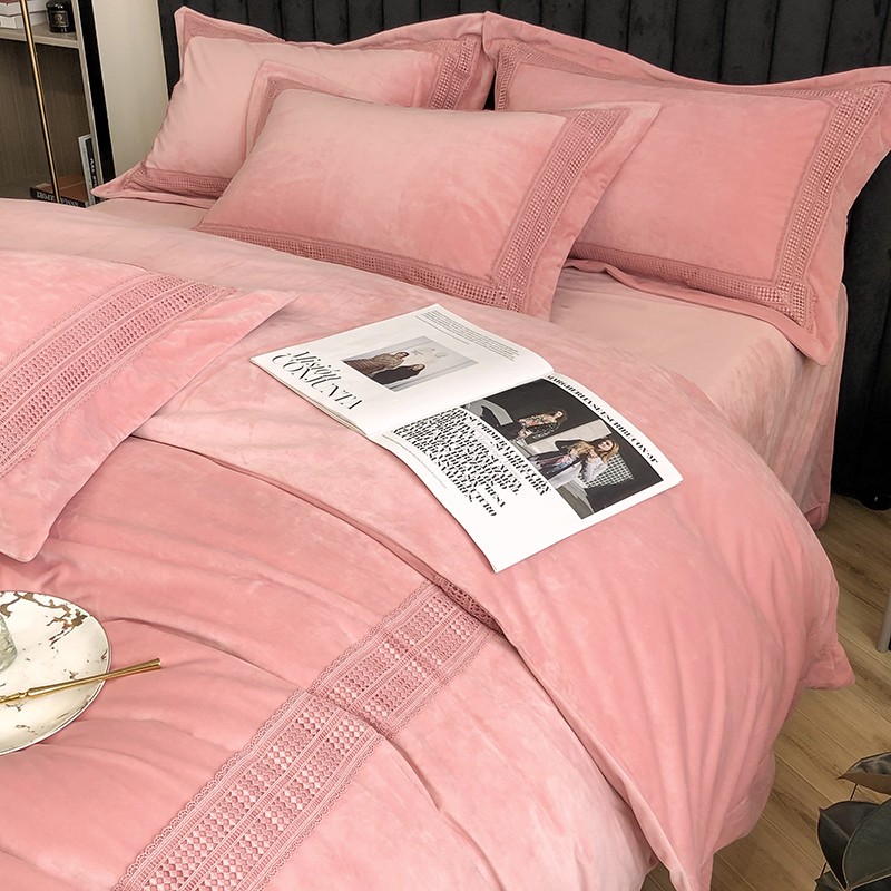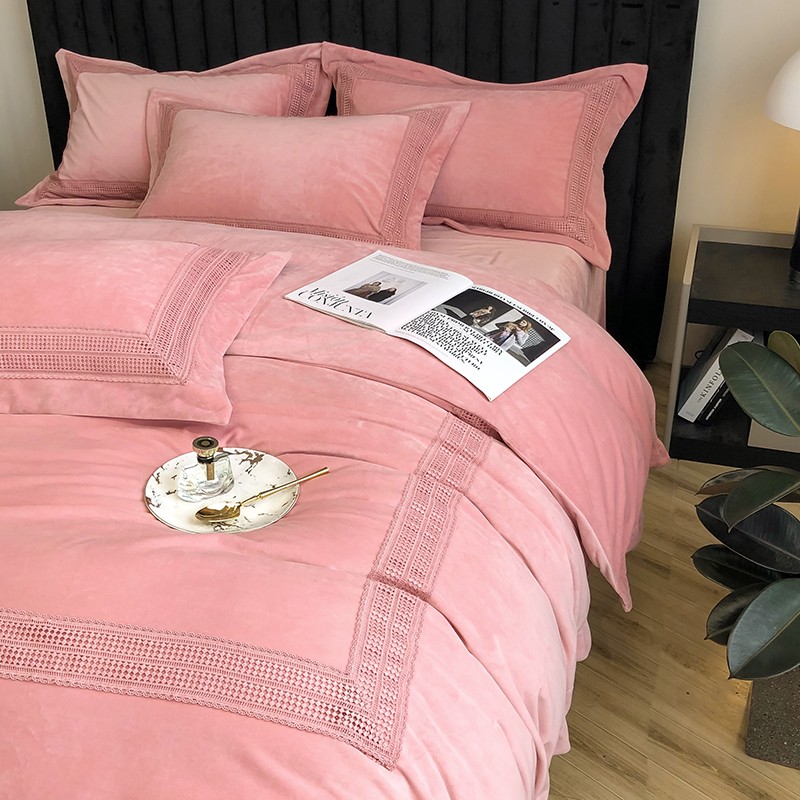 淼铭家纺新款A类婴肤绒水溶花边牛奶绒四件套-雅系列雅-樱花粉